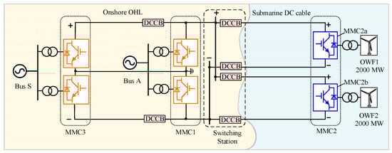 The offshore segment includes OWF 1, OWF 2, and offshore converter stations MMC2a and MMC2b, each connected to the collector system of one wind farm. This segment converts the wind power to DC for transmission to the onshore system. For simplicity, MMC2a and MMC2b are equivalently represented as a single converter station, MMC2, in the subsequent analysis. The onshore embedded segment consists of converter stations MMC1 and MMC3, connected to Bus A in grid F and Bus S in the southern grid of Jiangsu, respectively. The symmetric bipolar wiring mode of MMC1 and MMC3 is implemented using separate valve groups for the positive and negative poles, thereby ensuring redundancy in onshore power transmission. Given the inherent lack of fault current blocking capability in the half-bridge MMC, the proposed system is equipped with Direct Current Circuit Breakers (DCCBs) to enable the rapid interruption of fault current.