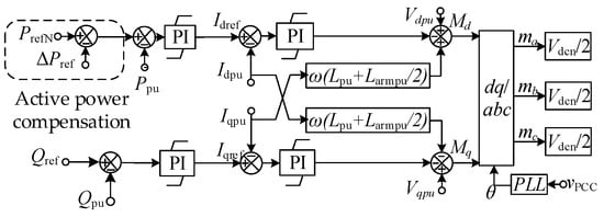 Since the wind farm output at MMC2 is uncontrollable, ΔPMMC2 fluctuates in accordance with the actual wind farm output. Therefore, the active power support ΔPMMC3 at MMC3 must be adjusted in real-time according to Equation (6) to compensate. Figure 8 shows the corresponding control structure of MMC3 with the active power compensation.