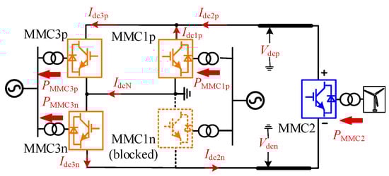 Given the symmetry of the onshore bipolar DC system, the following analysis only focuses on the outage of the negative pole converter, MMC1n. Under this contingency, converter MMC3n must maintain the negative pole DC voltage to ensure system operation. The corresponding power flow of the hybrid HVDC system is illustrated in Figure 9.