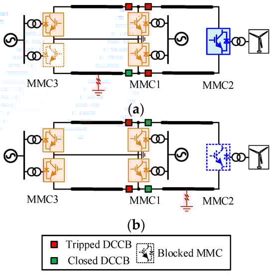 The system enters an asymmetric operating mode when one pole of the onshore HVDC is shut down for maintenance or a fault. In this mode, the non-fault pole continues normal operation, while the remaining converters in the faulty pole sustain the DC voltage of that pole, enabling the offshore symmetric monopolar HVDC to remain in operation and ensuring uninterrupted wind power transmission. The corresponding operating scenarios are illustrated in Figure 6c,d.