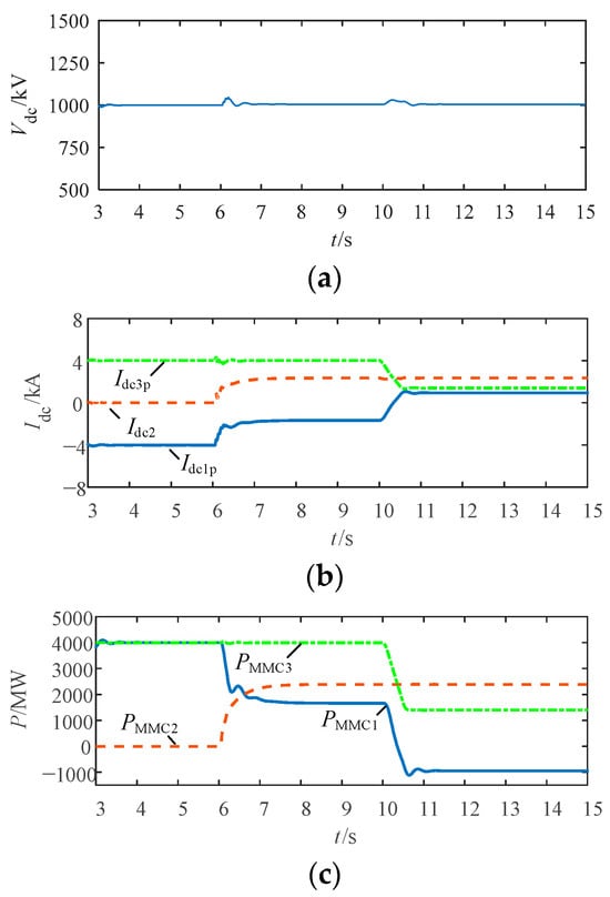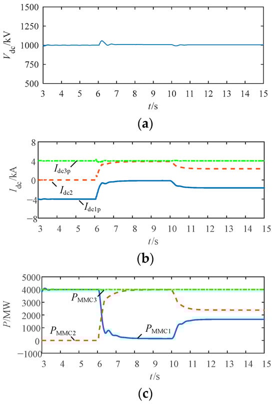 where PMMC1, PMMC2, and PMMC3 denote the active powers at converter stations MMC1, MMC2, and MMC3, respectively, whose positive directions are consistent with those in Figure 6a.