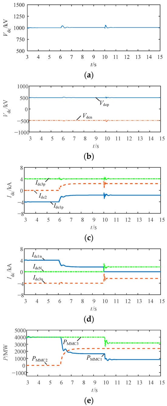 The simulation results demonstrate that following the outage of MMC1n and the subsequent transition to asymmetric operation, MMC3n promptly activates its backup constant DC voltage control. This ensures stable operation of the onshore negative DC pole, with MMC3n continuing to receive half of the power (1200 MW) transmitted by the offshore HVDC. Meanwhile, MMC1p and MMC3p maintain their original control strategies. Supported by the power supplement from MMC1p, MMC3p retains its full rated transmission capacity of 2000 MW. As a result, the system preserves a high level of power transmission capability even under a one-pole outage condition.