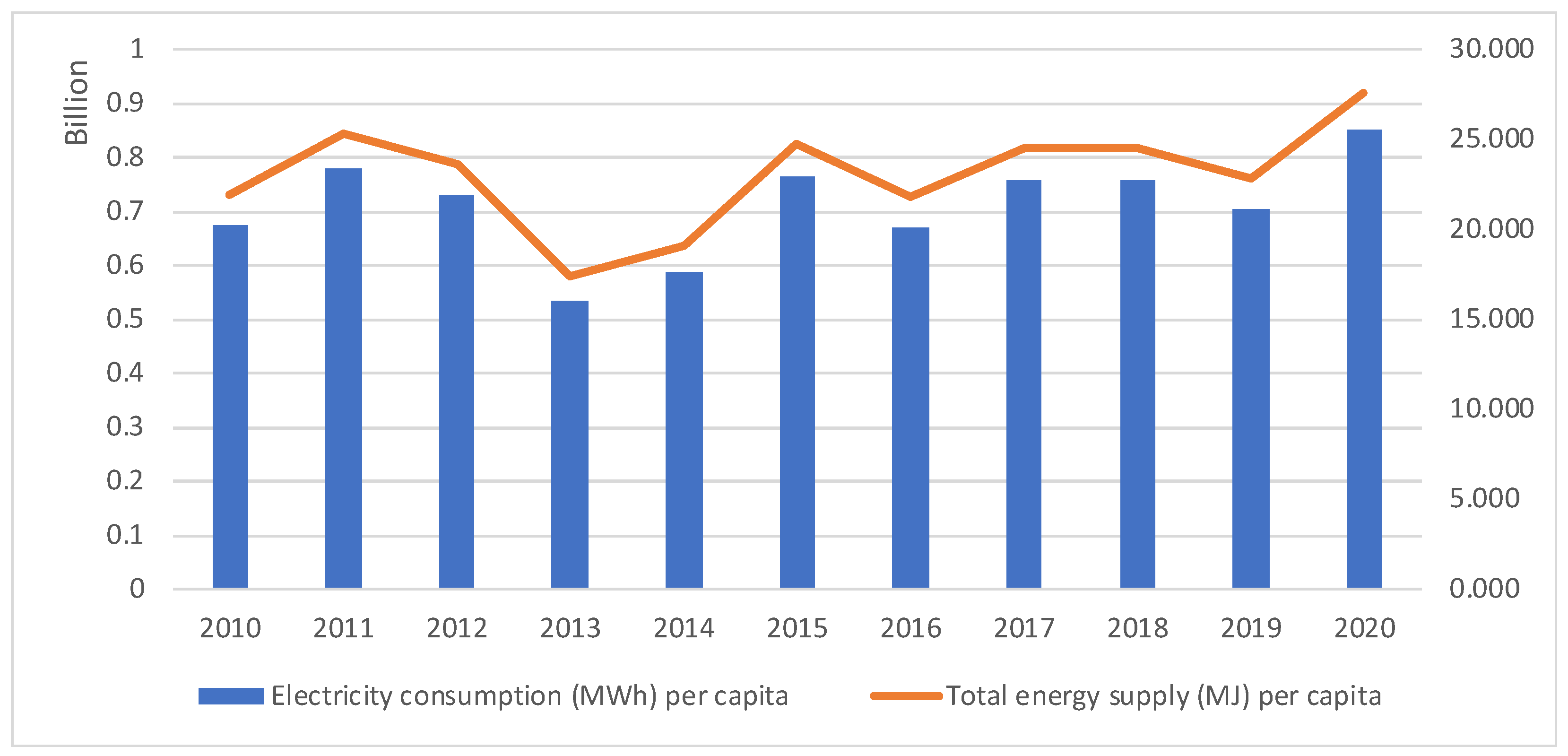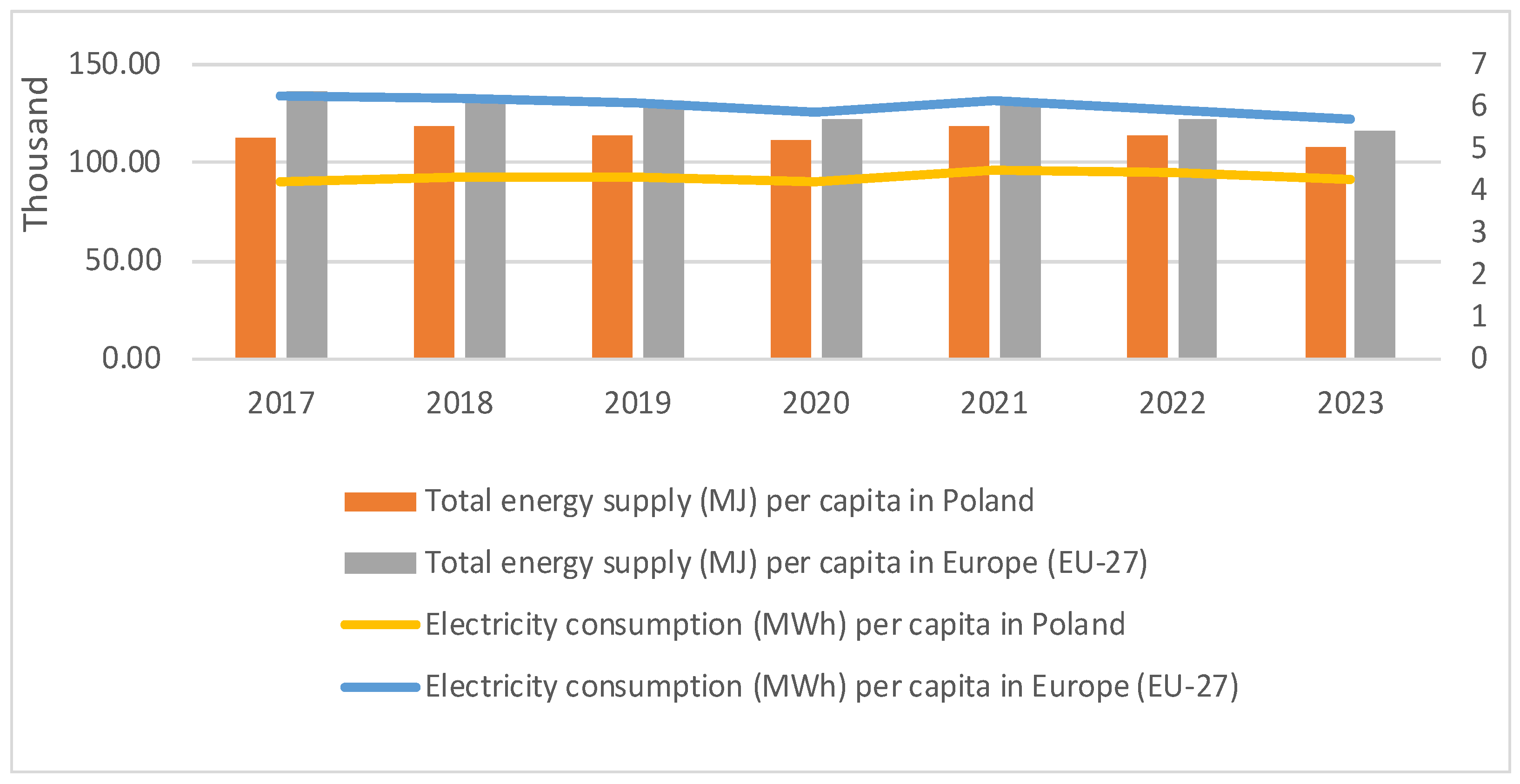 - Brodny, J.; Tutak, M.; Grebski, W. Empirical Assessment of the Efficiency of Poland’s Energy Transition Process in the Context of Implementing the European Union’s Energy Policy. Energies 2024, 17, 2689. [Google Scholar] [CrossRef]