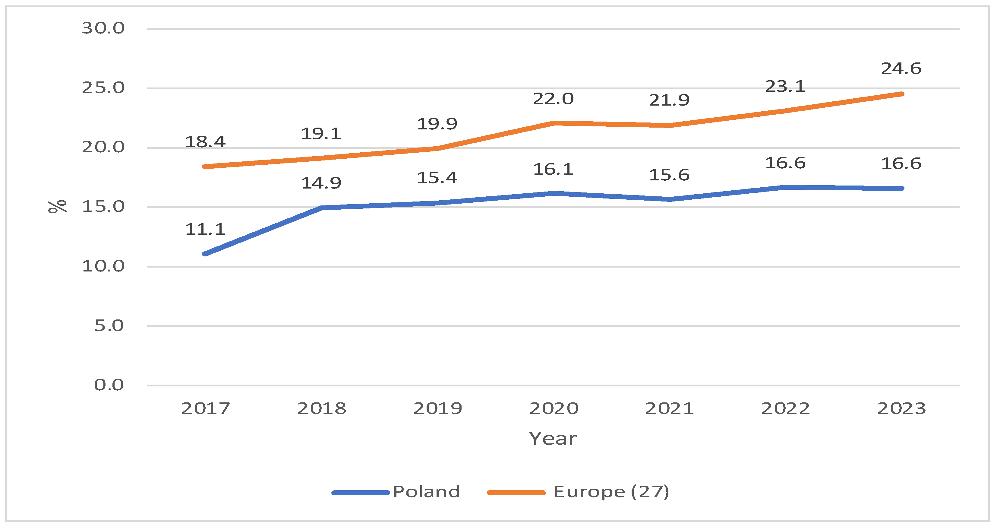 - Igliński, B.; Pietrzak, M.B.; Kiełkowska, U.; Skrzatek, M.; Kumar, G.; Piechota, G. The assessment of renewable energy in Poland on the background of the world renewable energy sector. Energy 2022, 261, 125319. [Google Scholar] [CrossRef]