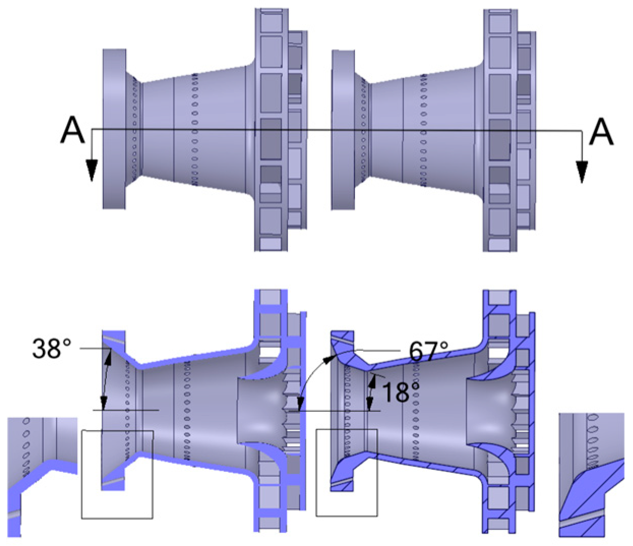 - A larger swirler outlet diffusion angle promotes the formation of wide, low-momentum recirculation zones, which benefits flame stabilization and the development of a broad high-temperature region. The resulting lower outlet velocity leads to milder mixing, with hot spots located closer to the inner liner of combustor. Conversely, a smaller diffusion angle favors the generation of a compact, high-velocity central jet. Near the center axis, local high-temperature, strong recirculation zones form, and the interaction between the high-speed jet and surrounding low-speed gas creates intense shear layers, enhancing turbulence and accelerating mixing, which shifts hot spots closer to the jet region.