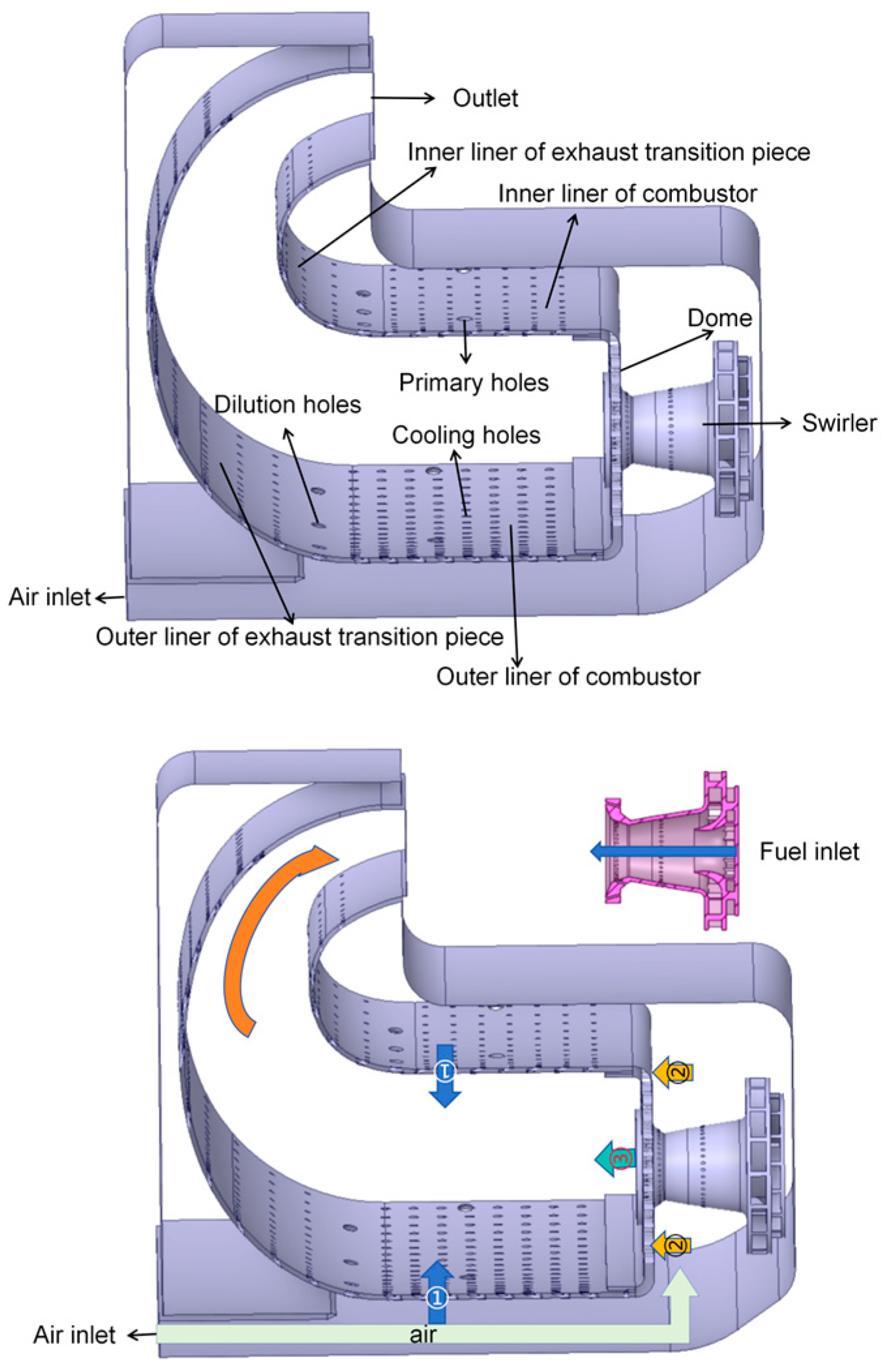 - In Configuration 1, the two symmetric vortex structures within the primary recirculation zone are more stable. Cool air entering through the cooling holes effectively envelops the high-temperature gas, resulting in lower hot spot temperatures on the combustor liner. In Configuration 2, fuel droplets and air exiting the swirler possess higher axial velocities. The vortex structures in the primary recirculation zone are less stable, and the jet from the primary holes induces strong disturbances in the fuel distribution, leading to higher wall temperatures.