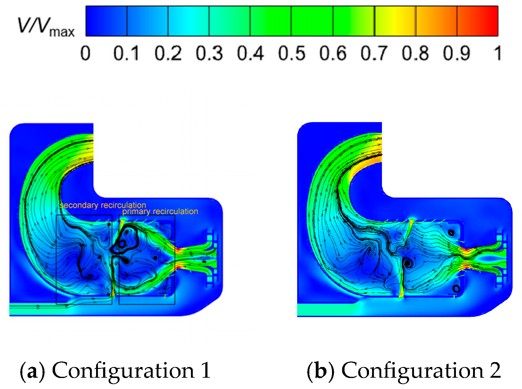 - In combustion chambers equipped with two different swirler configurations, the high-speed jets from the primary holes divide the high-temperature gas into two distinct regions. In the fluid domain, the high-temperature region in Configuration 1 is mainly concentrated within the primary recirculation zone, whereas in Configuration 2, high-temperature regions are extensively present in both the primary and secondary recirculation zones.