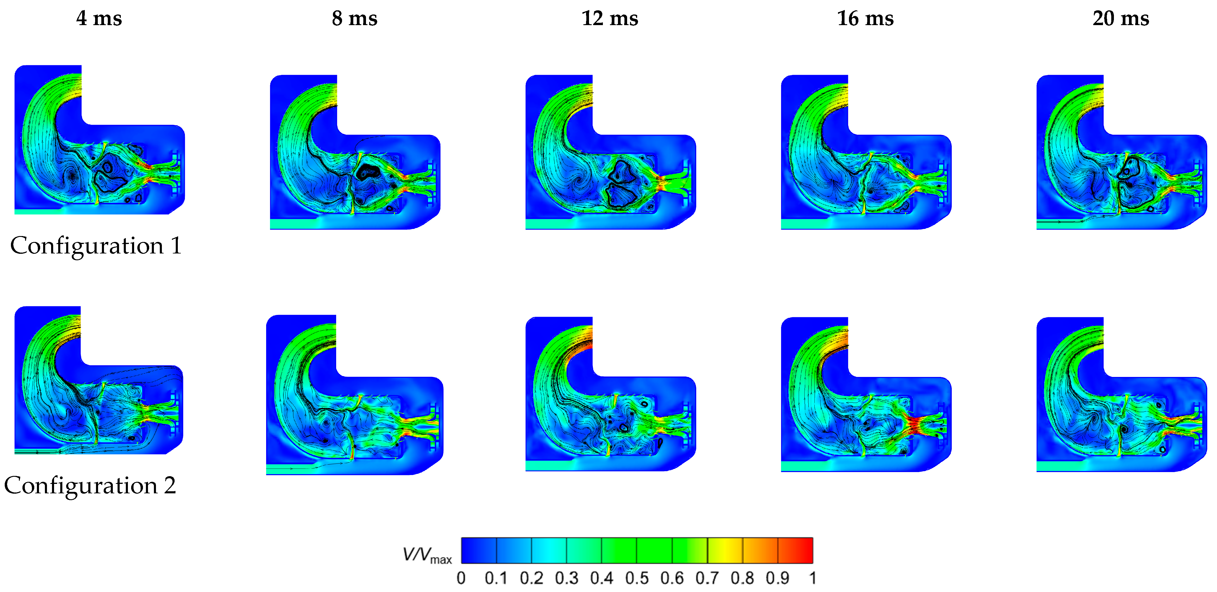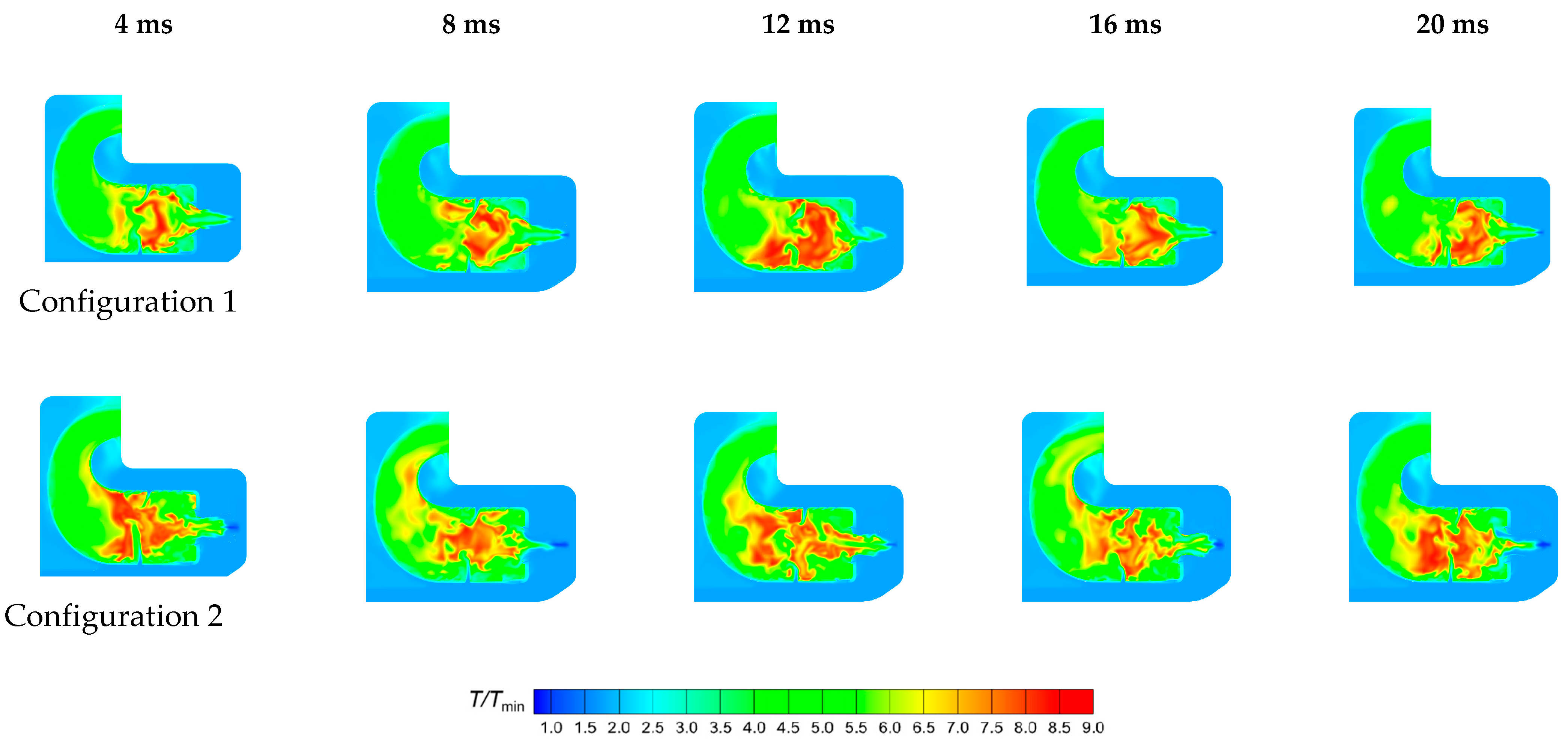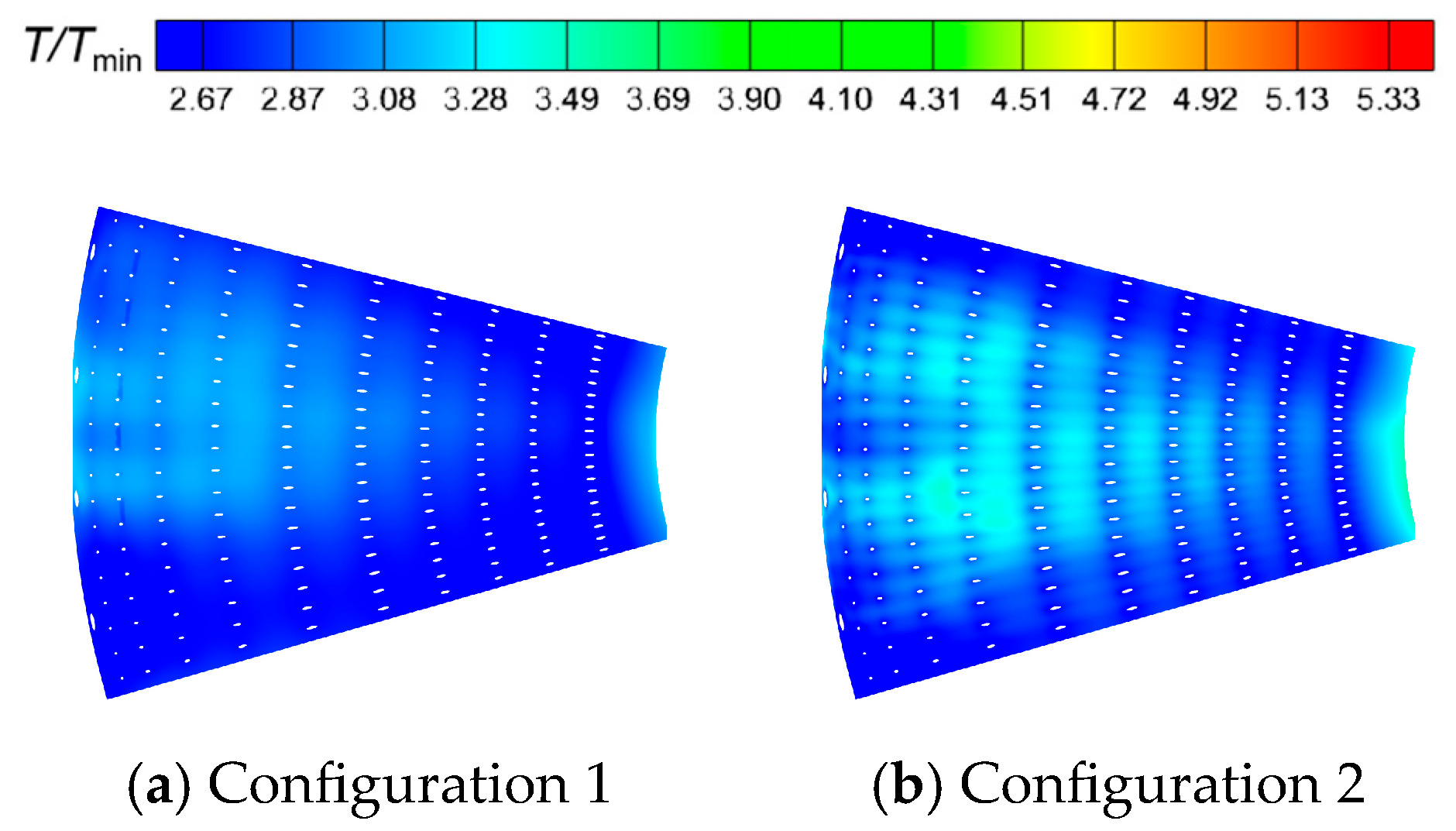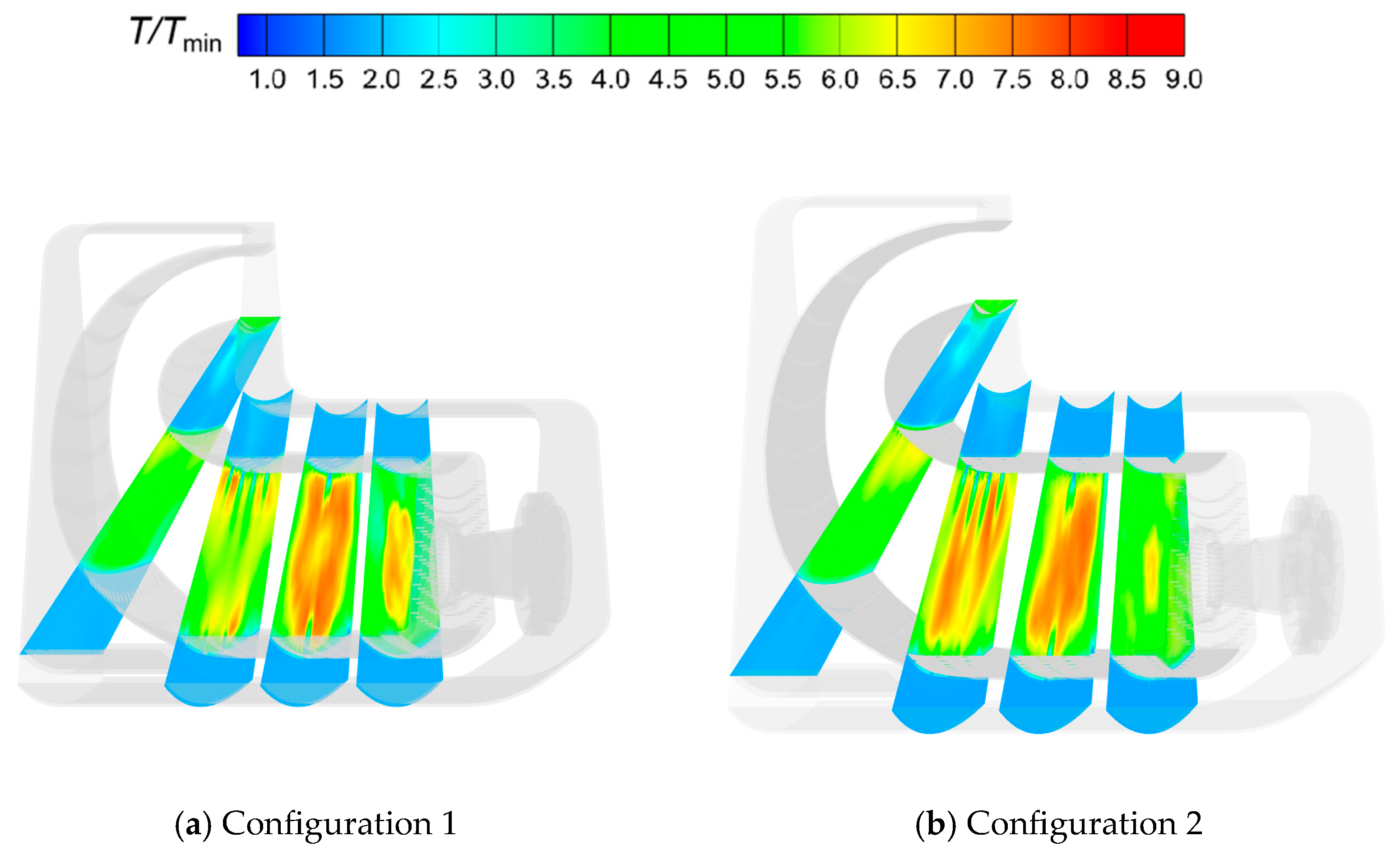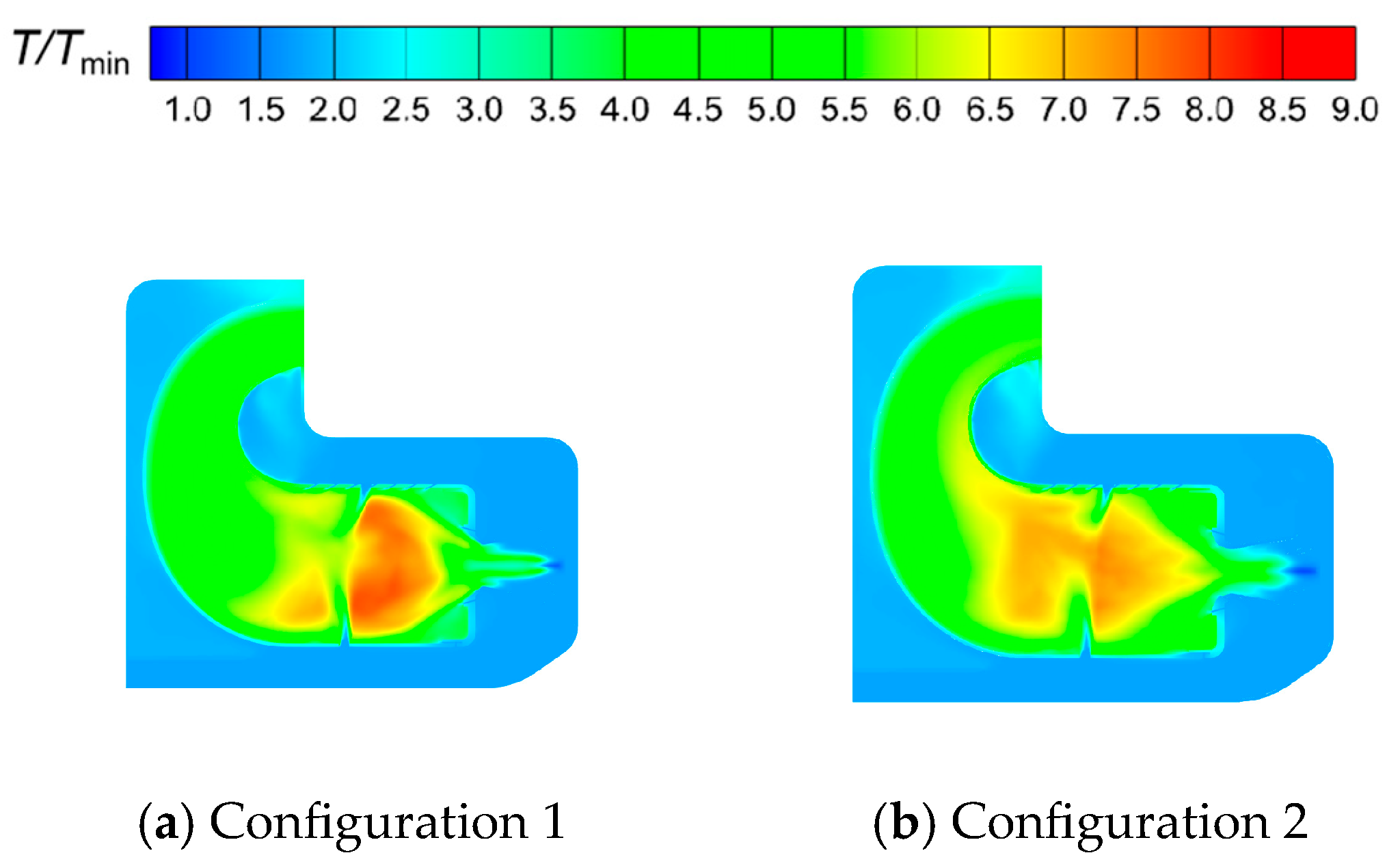 - The temperature distribution at the outlet of Configuration 1 is relatively uniform, with no obvious hot spots. In Configuration 2, the axial extent of high-temperature gas within the combustion chamber is larger, making hot spots at the outlet more pronounced. These hot spots primarily occur within the inner half of the outlet region and migrate circumferentially.