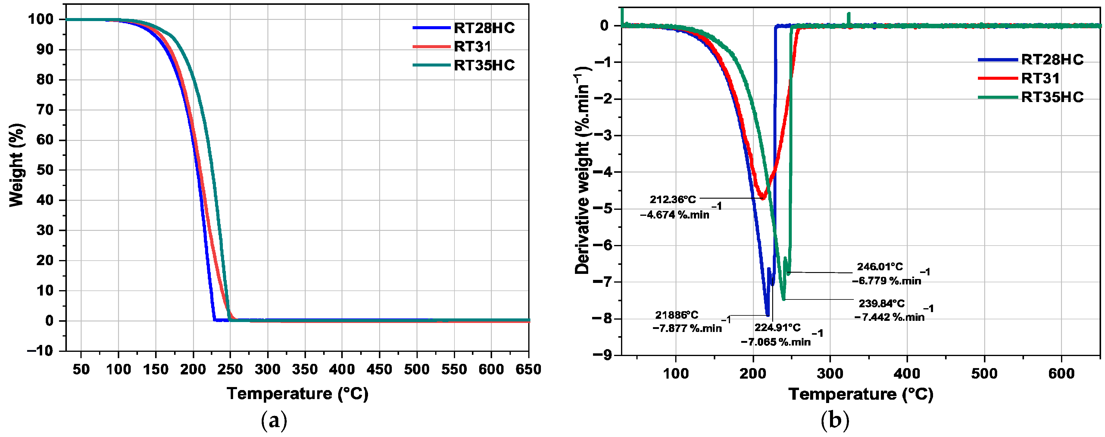 | PCM | Degradation Temperature (°C) | T5% (°C) | T25% (°C) | T50% (°C) | T100% (°C) |