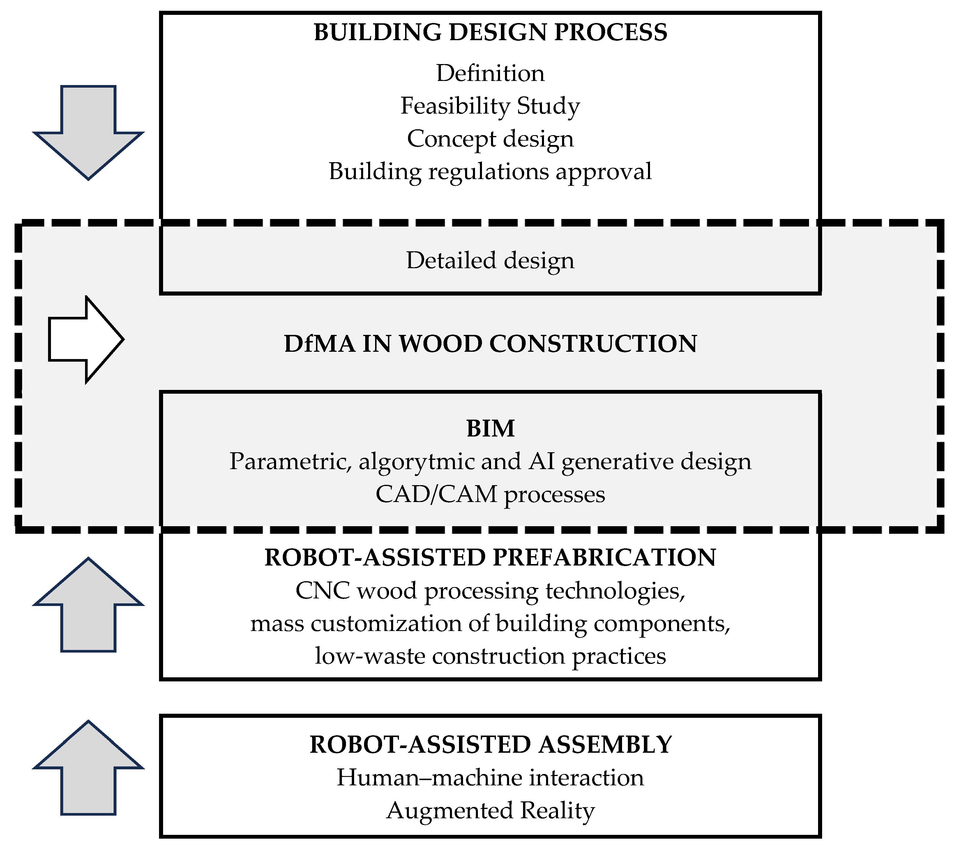 - Tuvayanond, W.; Prasittisopin, L. Design for Manufacture and Assembly of Digital Fabrication and Additive Manufacturing in Construction: A Review. Buildings 2023, 13, 429. [Google Scholar] [CrossRef]