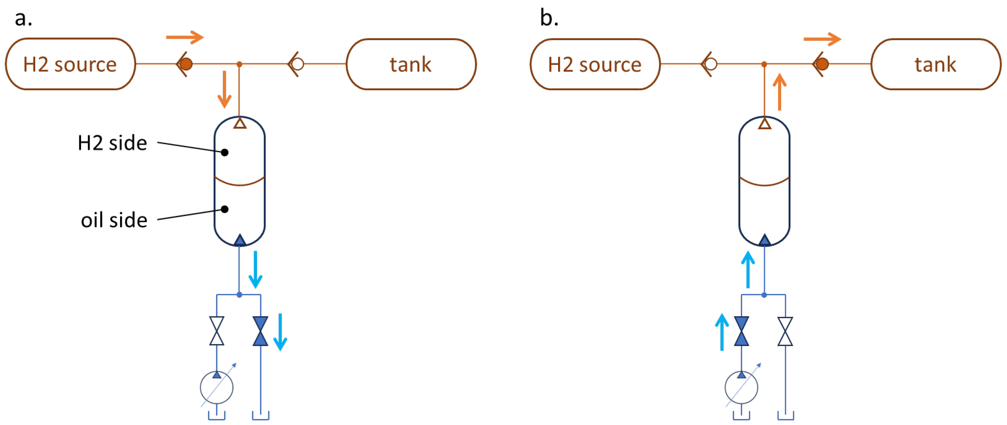 28]. The former project investigated the capability of hydrogen compression through hydraulic power, focusing on passenger vehicle refueling. Scaling up of the system is necessary to handle large-vehicle refueling applications that require hydrogen delivery rates of hundreds of kilograms per hour, such as refueling stations for bus fleet depot, trucks or trains. The basic principle is exploiting hydraulic power to compress hydrogen through hydro-pneumatic bladder accumulators. Pumping oil into the accumulator deforms the bladder containing H