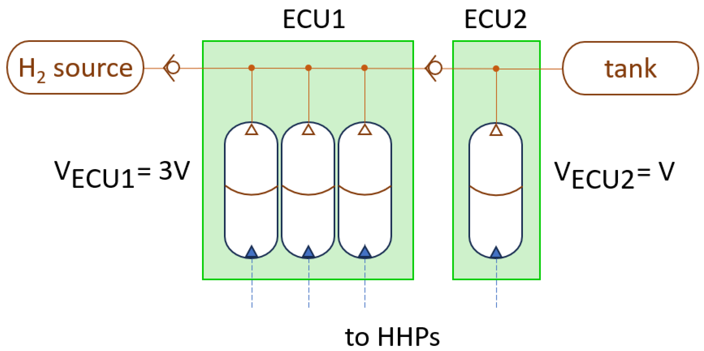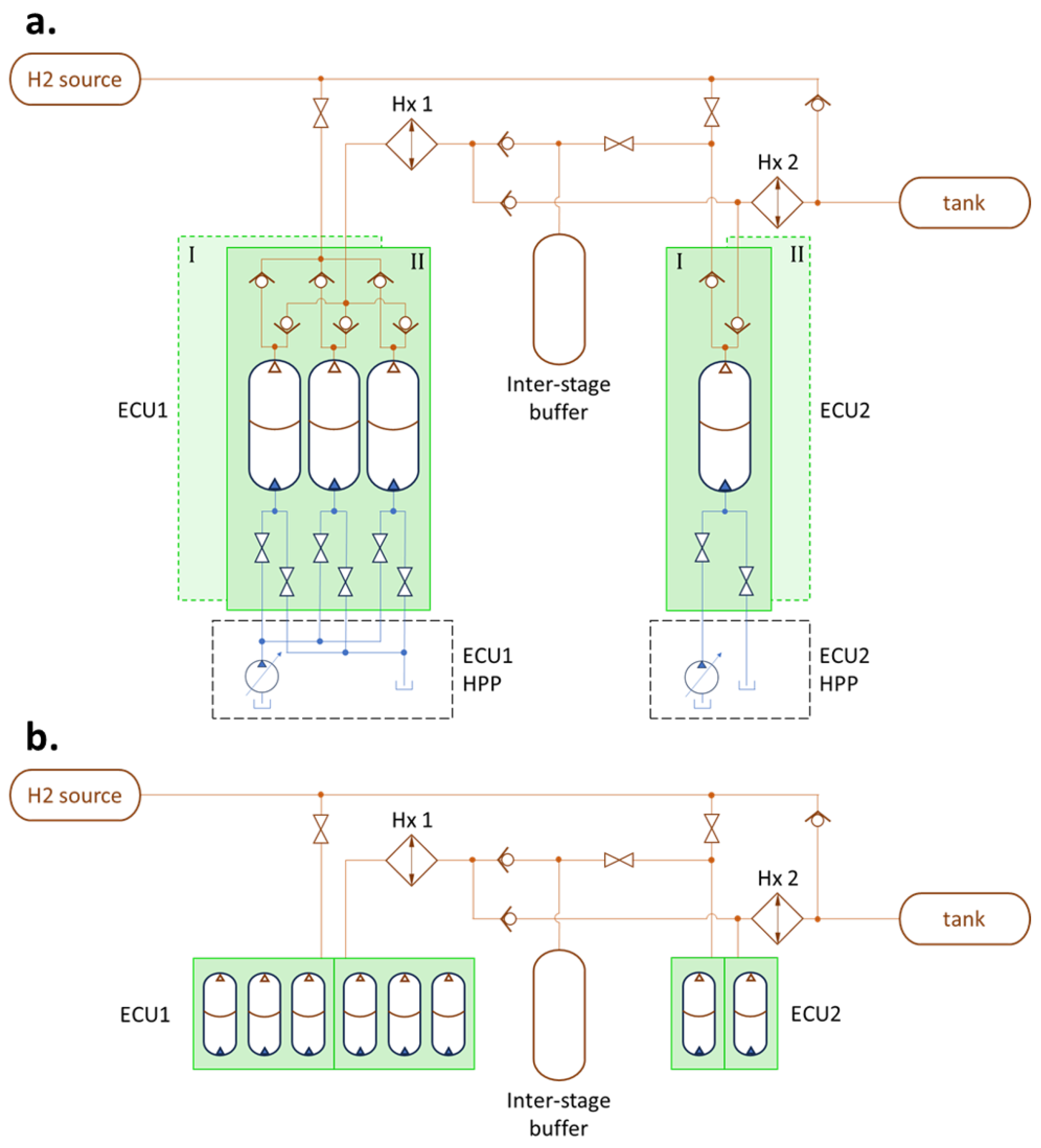 15] as reference, we must consider using at least two compression units through hydro-pneumatic accumulators. For simplicity, we will refer to these two compression units as Elementary Compression Units 1 and 2 (ECU1 and ECU2, respectively). It is important to note that we consider 5 MPa to be the worst-case scenario, representing the minimum pressure level in an empty H