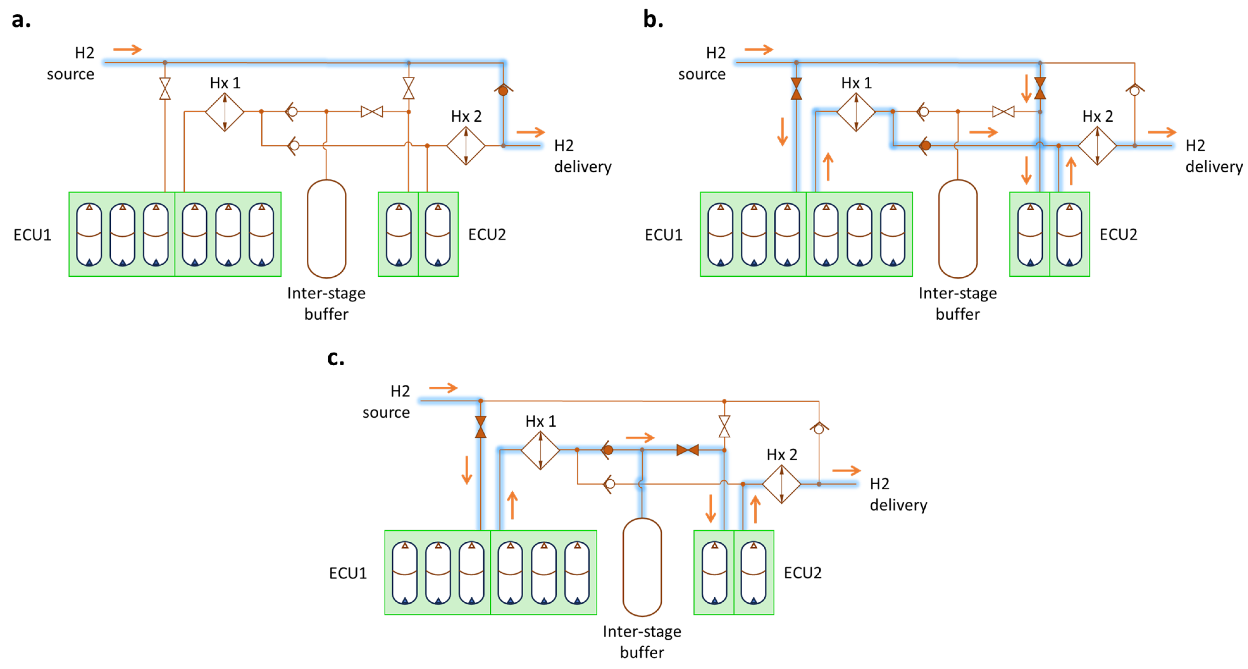 Note that we considered that the quantity of H2 executed by stage 1 after the first compression to occupy the dead volume of ECU1 and the expanded unit of ECU2.