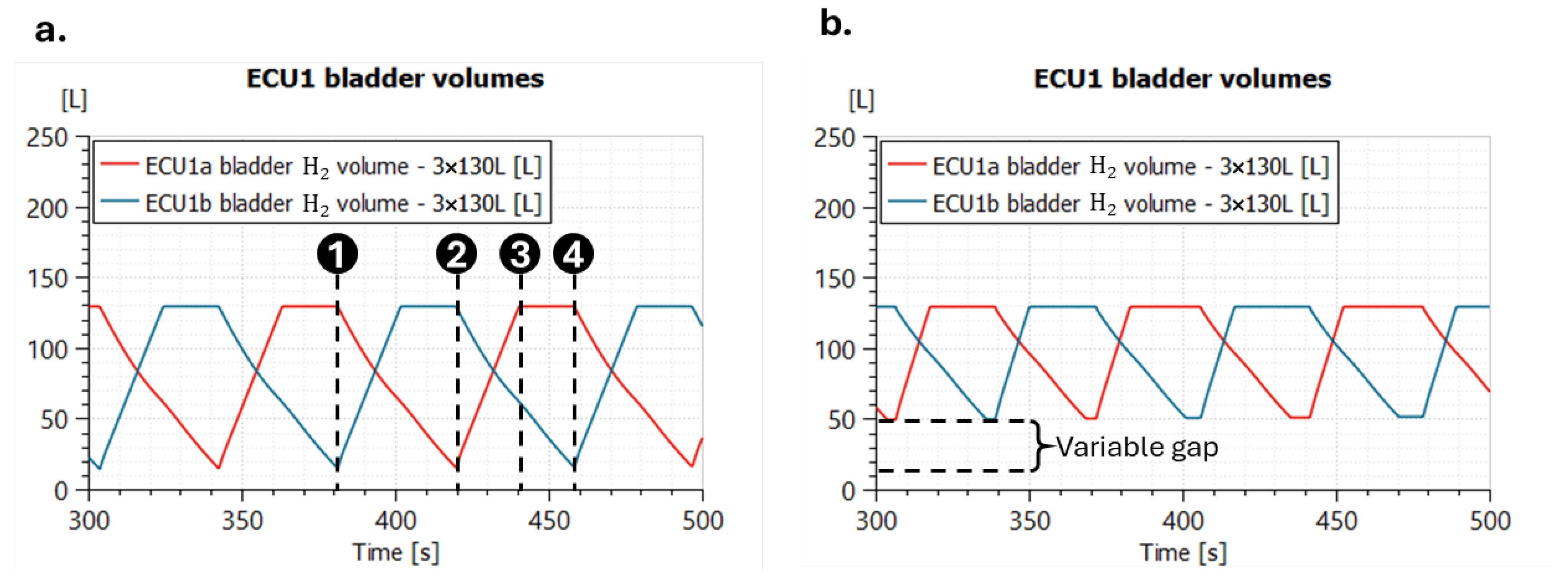. This lower ratio results in partial fillings and incomplete compressions of ECU1 bladders in Serial mode, as shown in the “ECU1 bladder volumes” graph already-mentioned.