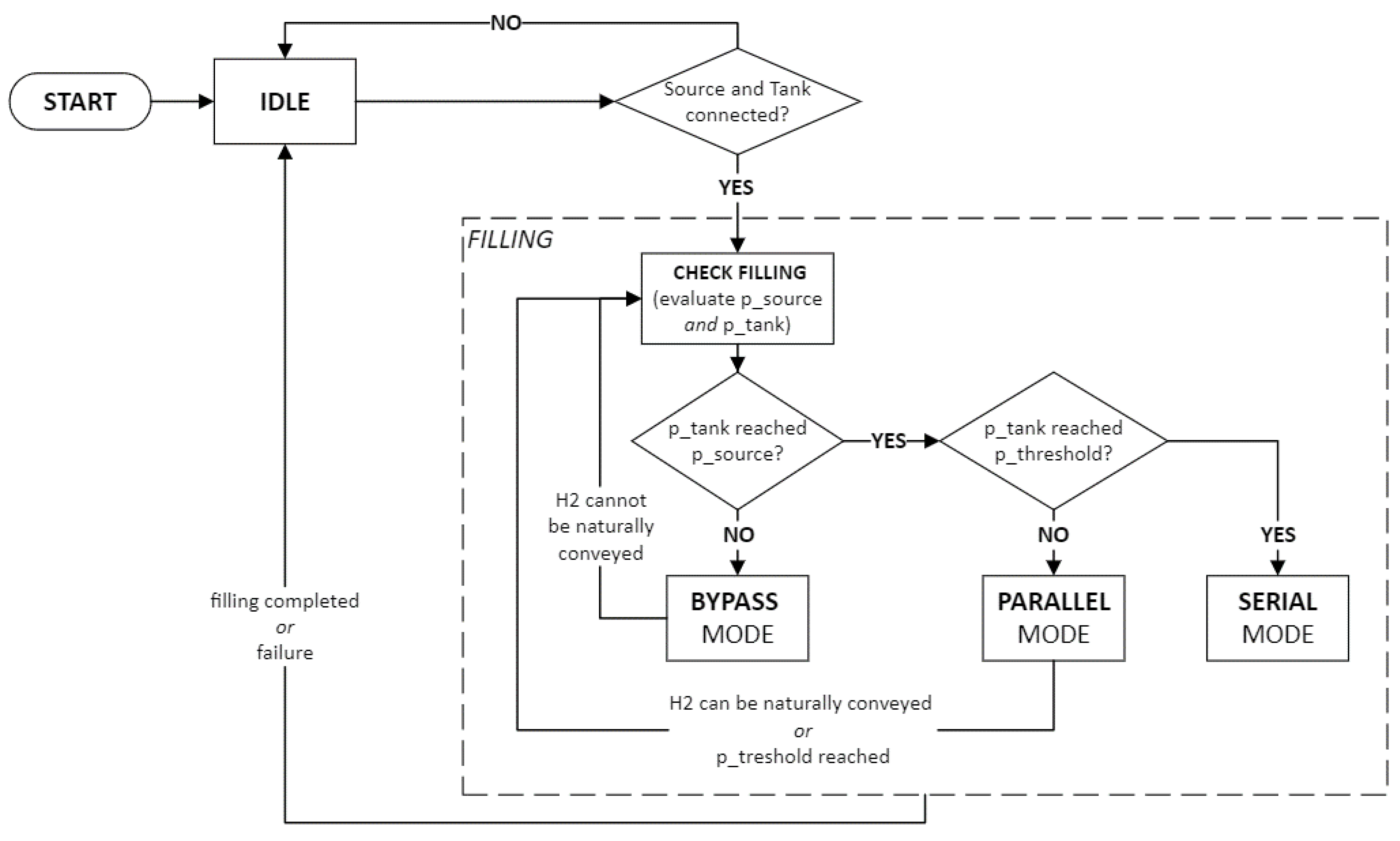 11)). In this work, in fact, only one compression stage is used until a fixed threshold pressure is reached, independent of the filling conditions. The logic exits the filling loop and returns the system to its idle state once the refueling is completed or if any generic failure or anomaly occurs.
