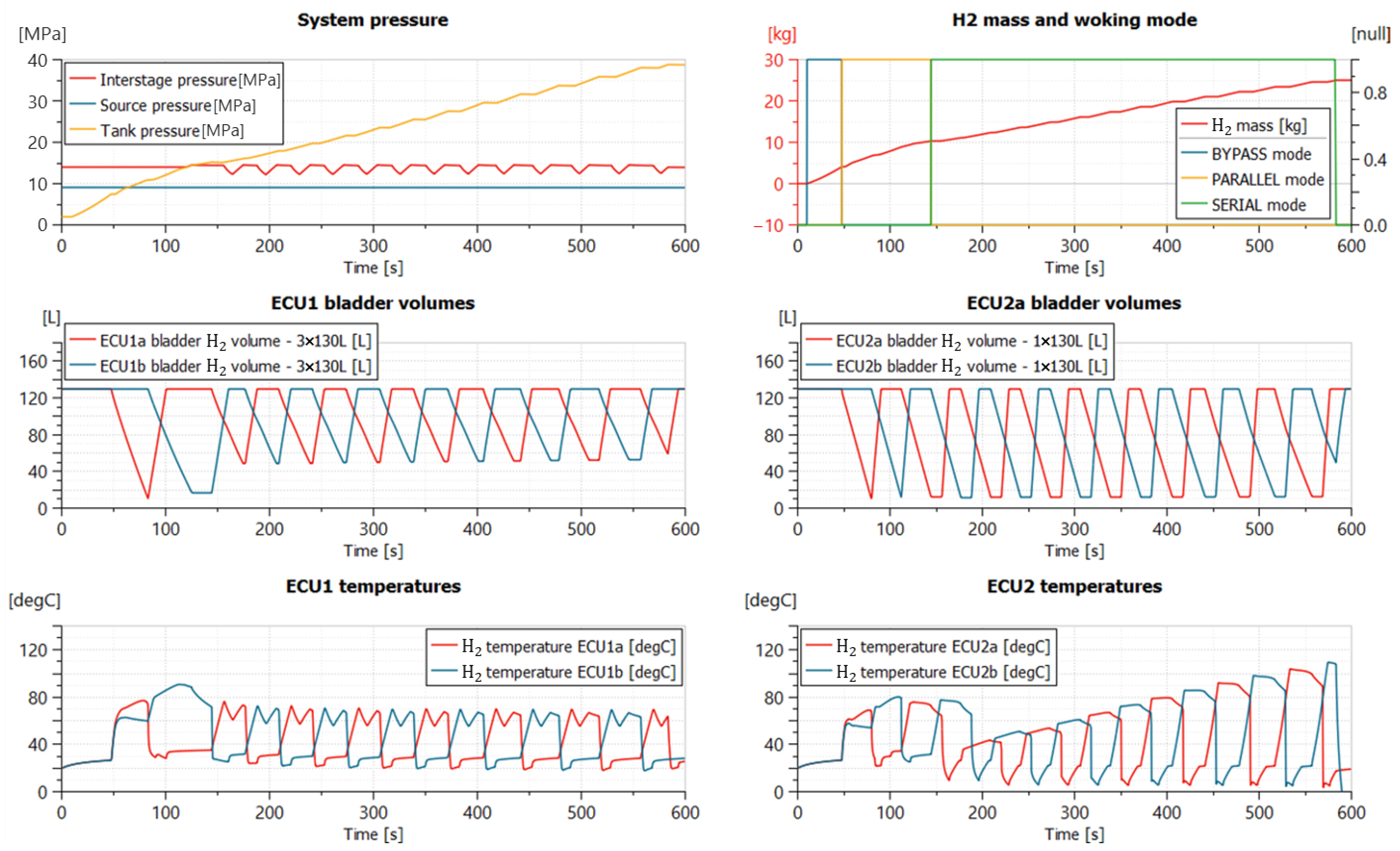 2 mass and working mode” graph shows how Serial mode is the predominant filling mode during this refueling cycle. This aspect is emphasized at high source pressure, where Parallel mode can only work within a restricted pressure range from the source to the fixed threshold pressure (i.e., 14 MPa). The choice of a constant threshold pressure also impacts the volumetric efficiency of ECU1, as depicted in the “ECU1 bladder volumes” graph. The selected pressure of 14 MPa, in fact, as stated in the paper, provides a good balance for low pressure source as the ECU1 compression ratio (Equation (