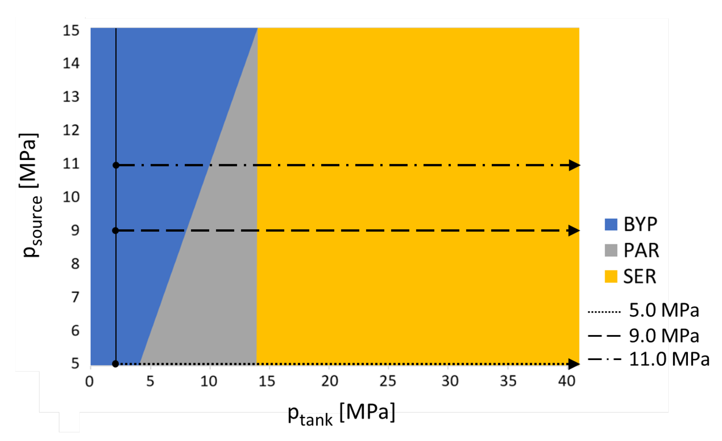 Figure 11 shows the working areas of the three modes under consideration, implementing the strategy with constant threshold pressure. Each point in the plane shows the current boundary conditions of the filling, and each horizontal line represents a filling cycle. Selecting a fixed threshold pressure of 14 MPa, therefore, results in a vertical straight line that serves as the boundary between Parallel and Serial mode.
