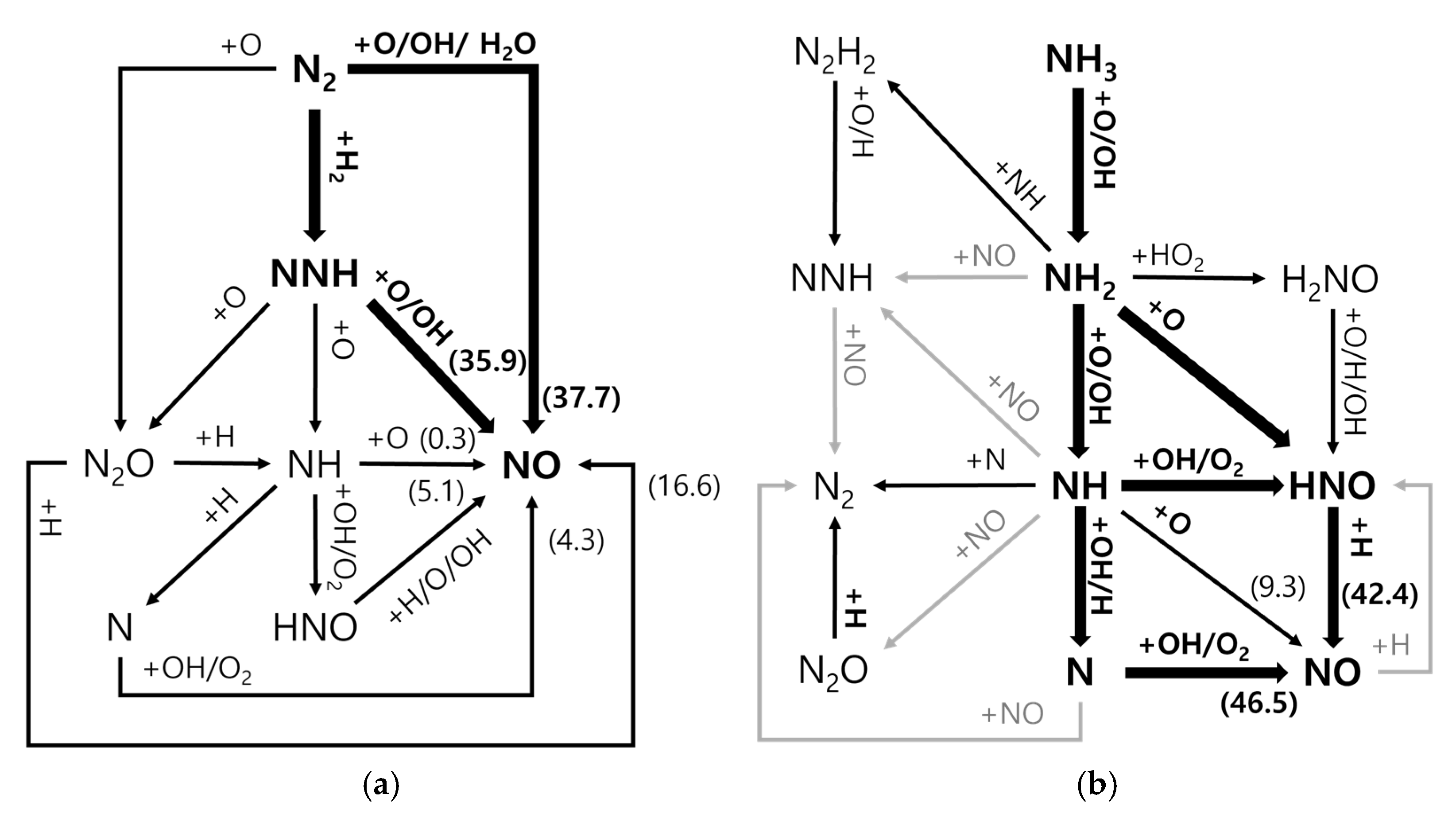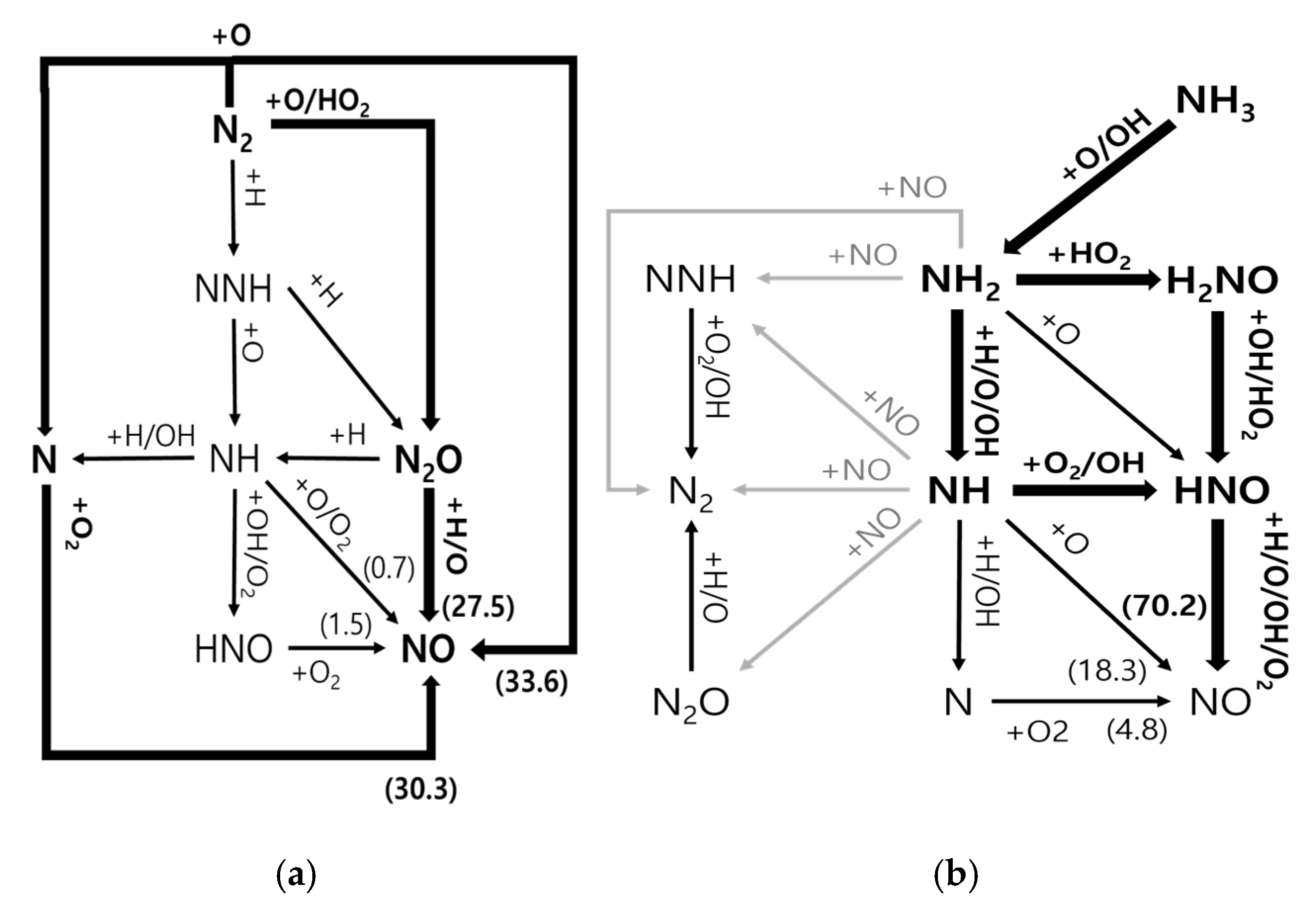- Glarborg, P.; Miller, J.A.; Ruscic, B.; Klippenstein, S.J. Modeling nitrogen chemistry in combustion. Prog. Energy Combust. Sci. 2018, 67, 31–68. [Google Scholar] [CrossRef]
