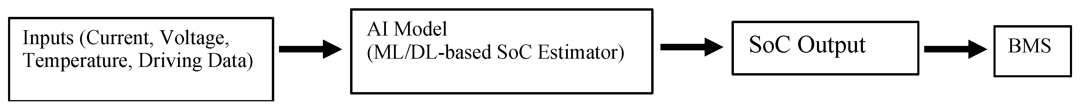 Accurate SoC/SoH is foundational because energy estimates and range predictions depend heavily on battery state. DNNs (feed-forward, LSTM, CNN and ensemble methods (XGBoost/CatBoost) have been applied using current, voltage, temperature, and historical cycling features; results generally show improved accuracy over classical equivalent-circuit/extended Kalman filter approaches when properly trained and regularized [27,28]. Hybrid approaches that augment ML with online adaptation or metaheuristic tuning further improve robustness in varying thermal/usage conditions [29]. However, models remain sensitive to dataset representativeness (cycling regimes, aging) and require explicit mechanisms to avoid overfitting and ensure extrapolation to new battery chemistries.