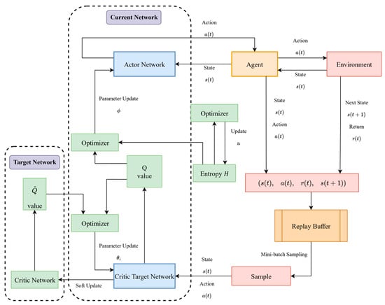 This study adopts the SAC algorithm as the foundational framework, as illustrated in Figure 3. By introducing an entropy regularization term while maximizing the expected return, SAC enhances the exploration capability of the policy. Moreover, the use of twin Critic networks and target networks effectively mitigates the overestimation problem of Q-values, thereby improving training stability, convergence speed, and sample efficiency.