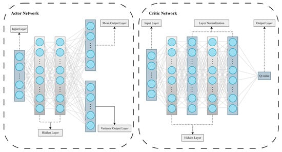 The algorithm adopts an Actor–Critic architecture, as illustrated in Figure 4, where the Actor is responsible for generating a continuous action distribution, and the Critic estimates the state–action value function. This study follows this structure and further enhances its functionality on this basis.