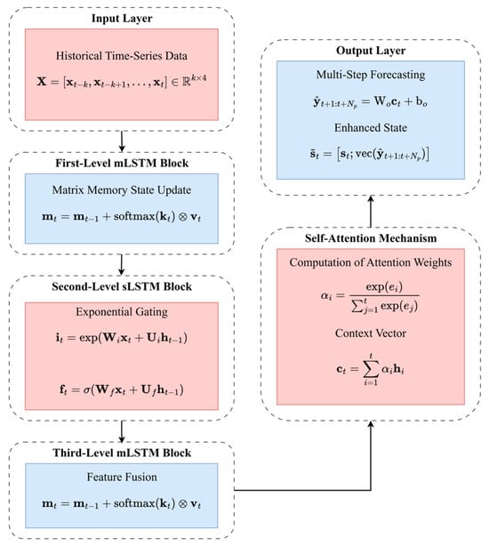 To enhance the algorithm’s capability of perceiving future states, an Attention–xLSTM prediction module is introduced. The xLSTM used in this work is an extended variant of the conventional LSTM, which enriches the gating and memory-update mechanism so that the network can capture long- and short-term dependencies at multiple temporal scales. Compared with standard LSTM, xLSTM alleviates issues such as limited ability to represent multi-scale temporal patterns, sensitivity to long-sequence vanishing gradients, and insufficient separation between trend and fluctuation components. As illustrated in Figure 5, the module adopts a three-layer stacked structure consisting of mLSTM–sLSTM–mLSTM, which achieves high-precision forecasting of electrical load and renewable generation through multi-scale temporal modeling and attention-based feature extraction.