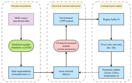 At the scheduling level, deep reinforcement learning has been widely investigated for economic dispatch and energy management. Reference [16] proposes an optimal scheduling framework for integrated energy systems that combines deep-learning-based prediction models with DRL, demonstrating that improved forecasts can translate into lower operating costs. Reference [17] uses a DDPG algorithm to control energy storage and power distribution between two microgrids with continuous action spaces. Reference [18] applies DRL to the economic dispatch of a VPP in the Internet-of-Energy environment. Reference [19] introduces an improved PPO algorithm with reward-based prioritization to enhance training stability and exploration efficiency. Safety-oriented DRL algorithms for energy-system scheduling are developed in Reference [20], where operational risks and constraint satisfaction are explicitly considered. SAC is employed in Reference [21] to optimize the joint scheduling of electrical and thermal energy storage, leveraging entropy regularization and twin critic networks. For low-carbon and networked multi-energy systems, Reference [22] adopts a multi-agent SAC algorithm for coordinated energy management of networked microgrids. Game-theoretic and hierarchical DRL frameworks for VPP trading and multi-microgrid coordination are presented in References [23,24]. In the specific context of virtual power plants, Reference [25] develops an intelligent scheduling scheme based on deep reinforcement learning, where a VPP environment model is constructed and DRL agents are trained to coordinate distributed resources and participate in electricity markets. These works demonstrate the strong potential of DRL for handling high-dimensional state spaces and complex operating conditions in integrated energy systems, but most of them still rely on relatively simple state representations and treat physical constraints mainly through reward penalties or action clipping.
