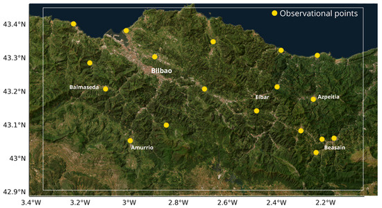 The study focuses on a domain situated in the northern Iberian Peninsula, centered on the metropolitan area of Bilbao, Spain. This region was selected due to its complex terrain and orography which, combined with coastal influences, significantly influence local wind patterns. Figure 1 illustrates the specific area of interest, which extends beyond the city itself to include key surrounding monitoring points. A distributed network of observational points was conceptually established across the area, effectively forming a sensor network.