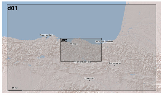 As mentioned in Section 1, one part of the proposed framework includes NWP with the aim of improve the raw output from the model. For this purpose, an essential input of the ML model is the data coming from the NWP model output. In this study, WRF (Weather Research and Forecasting) model version 4.6 [14] was used to simulate meteorological variables over the study area. WRF is a non-hydrostatic regional NWP model developed mainly by NCAR (National Center for Atmospheric Research) and its use is not only for research purposes, but also for operational weather forecasting, and its performance and accuracy, particularly for wind resource assessment, has been rigorously evaluated against in-situ measurements [15]. For consistency with the observational dataset, continuous WRF simulations were performed covering a full annual cycle, ensuring that the temporal overlap between simulations and measurements allowed for both the training and validation of the ML models. The simulations provided gridded meteorological wind variables (wind speed and wind direction), which were later used as predictors in the Machine Learning framework. Table 1 summarizes the main configuration of the WRF setup adopted for this study, including domain characteristics, spatial resolution, physical parameterizations, and boundary conditions. The configuration is based on two nested domains, where the inner one corresponds to the d02 (1 km resolution) and the outer one corresponds to the d01 domain. For an easy visualization of the area covered by the WRF model, Figure 2 shows the spatial configuration of the nested domains used in the WRF setup. It should be noted that only the outputs from the d02 domain are used in this study, since this high-resolution domain and fully covers the area where the sensor network is located