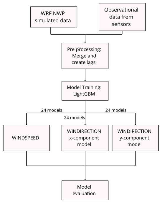 In all experiments, a ranking of feature importances, derived from the frequency and gain of variable usage in the ensemble of decision trees was saved. This analysis served to identify which predictors—among lagged observations, WRF forecasts, and station metadata—contributed most to correcting the model errors at different lead times. The overall workflow of the methodology is summarized in Figure 4 as a schema.