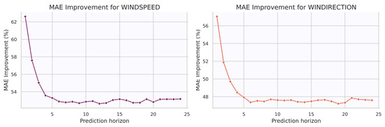 Finally, predictions for wind direction are provided by the 24 trained models. The improvement is again largest for the shortest lead time, reaching values above 56% at 1 h ahead. However, it decreases rapidly during the first few hours and stabilizes around 48% for longer horizons. This pattern is similar to that observed for wind speed, where the improvement also drops quickly after the initial hours. The rapid decay in relative improvement for both wind speed and wind direction highlights the inherent difficulty of predicting wind values. Figure 5 shows evolution of the Mean Absolute error computed for each 24 forecast horizon for both wind speed and wind direction target variables.