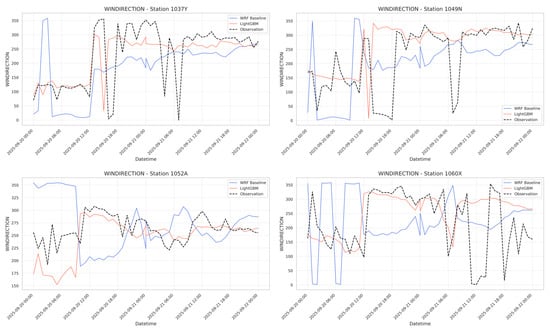 Table 4 was constructed by aggregating the results obtained for the 48 h test. For each model and the wind variables, the LGBM predictions and the WRF baseline were evaluated against observations. As shown in the methodology, the mean absolute error (MAE), the root mean square error (RMSE), and the Pearson coefficient (R) were obtained. For wind speed, metrics were calculated directly on the observed values. For wind direction, MAE and RMSE were computed using the minimal angular differences between the predicted and observed directions to properly account for the circular nature of the variable as