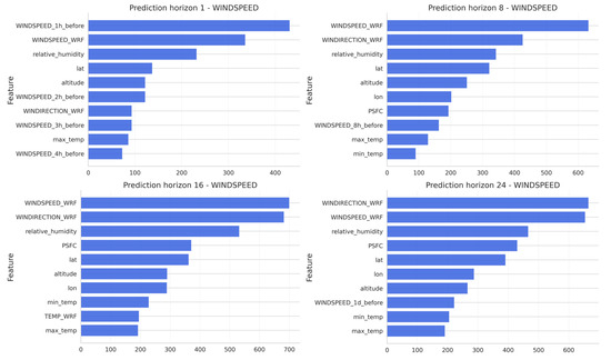 Related to the feature importance analysis for wind speed, Figure 7 shows the most important features obtained during the training period corresponding to the models of 1, 8, 16 and 24 h of horizon prediction. Results indicate that for very short lead times, recent lagged wind speed values are among the most influential predictors, together with WRF wind variables. However, as the forecast horizon increases, the relative contribution of lagged values decreases, and other predictors such as wind speed and wind direction from WRF model, relative humidity, and surface pressure gain more importance.