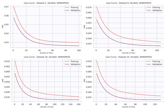 Figure 10 displays the loss curves obtained for wind speed prediction models at different lead times: 1, 8, 16, and 24 h ahead. In all cases, the MAE decreases rapidly during the initial boosting iterations and then progressively flattens, indicating that the model quickly captures the dominant predictive patterns and gradually fine-tunes residual errors. As expected, the absolute value of MAE is slightly higher for longer forecast horizons (e.g., 16–24 h) compared to shorter ones (1 h), reflecting the increasing intrinsic difficulty of prediction for longer horizons. The relative alignment of the training and validation curves indicates that the models maintain generalization capacity and do not suffer from overfitting, even when the number of boosting iterations increases. However, it is observed that the validation loss curve remains lower than the training one. While atypical, this behavior suggests that the validation dataset for wind speed contains samples that are inherently easier to predict or present less variance than the training set, leading to a higher model-observation agreement. It should be noted that this favorable condition might be specific to the wind speed variable and does not necessarily imply similar behavior for wind direction.