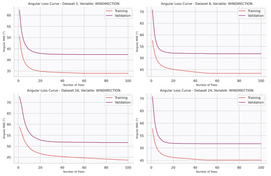 Similarly, Figure 11 presents the angular loss curves for wind direction prediction at different lead times: 1, 8, 16, and 24 h ahead. In this case, the metric reported is the angular mean absolute error (MAE), which quantifies directional discrepancies in degrees. As with wind speed, the curves show a steep initial decrease followed by progressive stabilization, indicating effective learning of the main predictive signals during the first boosting iterations. Moreover, a clear dependence on the forecast horizon is observed, with errors increasing from shorter (1 h) to longer (16–24 h) lead times. The parallel behavior of training and validation curves also suggests that the models achieve good convergence without signs of overfitting.