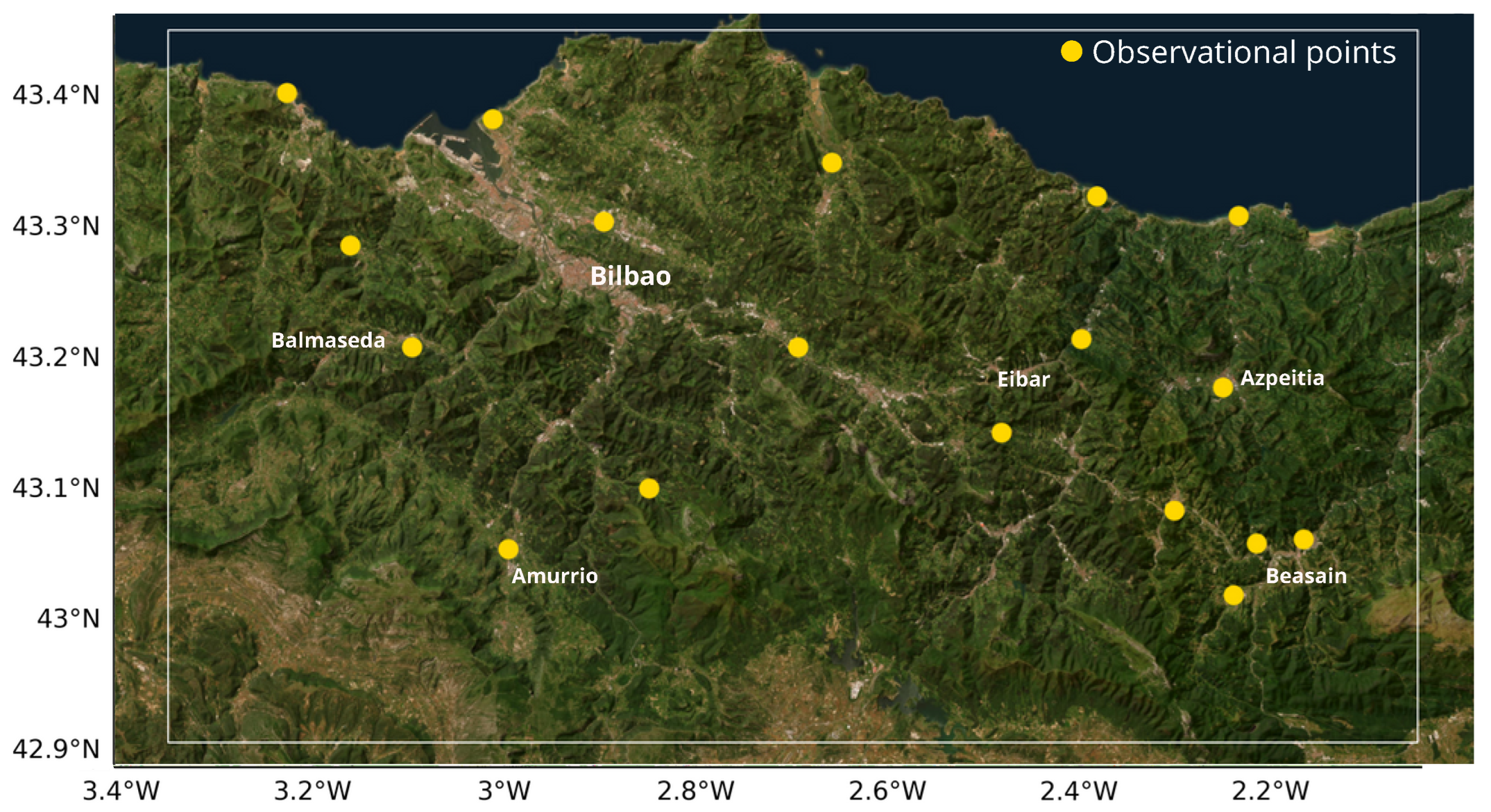 The study focuses on a domain situated in the northern Iberian Peninsula, centered on the metropolitan area of Bilbao, Spain. This region was selected due to its complex terrain and orography which, combined with coastal influences, significantly influence local wind patterns.