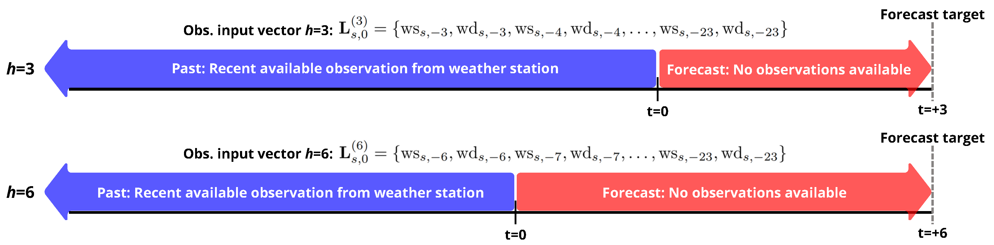 This formulation ensures that for each forecast horizon h, only observational data available at the time of forecast issuance (i.e., measurements up to ) are included in the training and prediction process, emulating realistic operational constraints.
