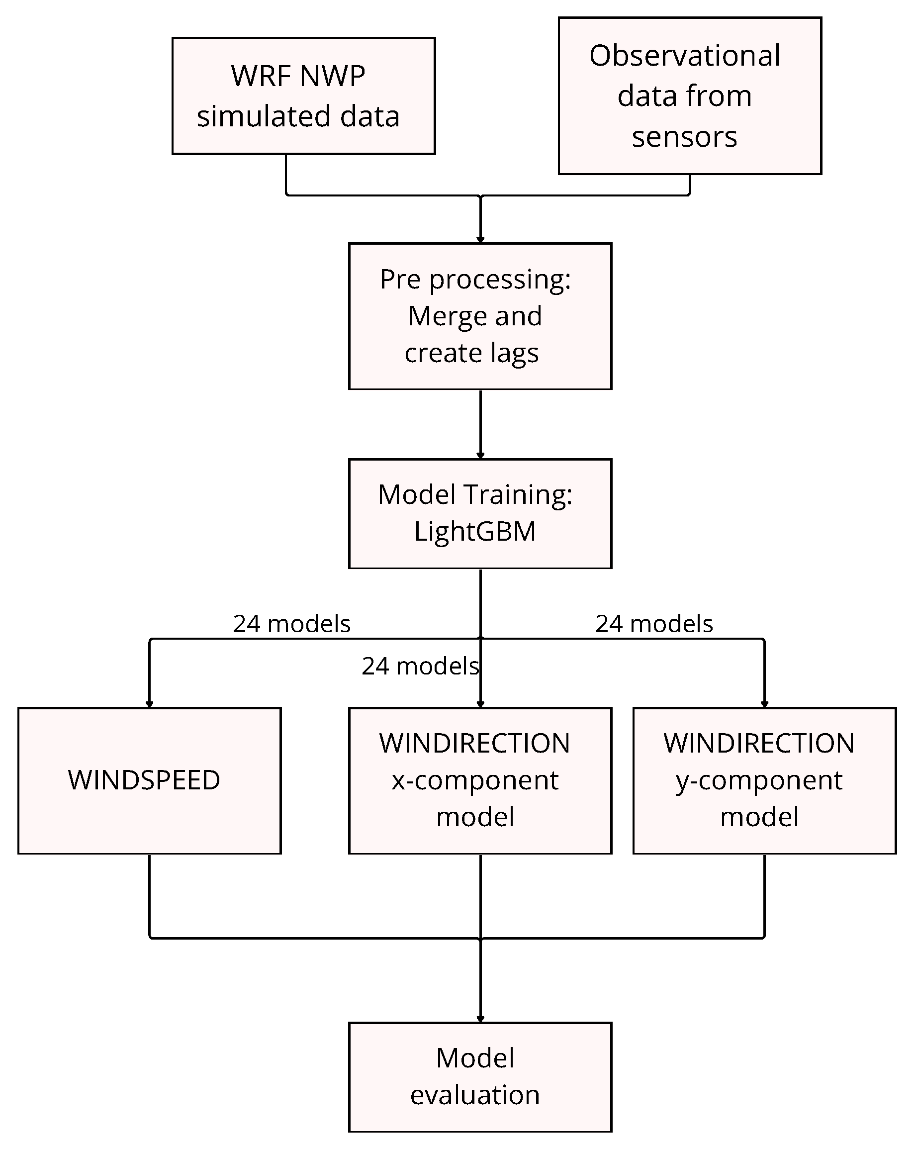 In all experiments, a ranking of feature importances, derived from the frequency and gain of variable usage in the ensemble of decision trees was saved. This analysis served to identify which predictors—among lagged observations, WRF forecasts, and station metadata—contributed most to correcting the model errors at different lead times. The overall workflow of the methodology is summarized in