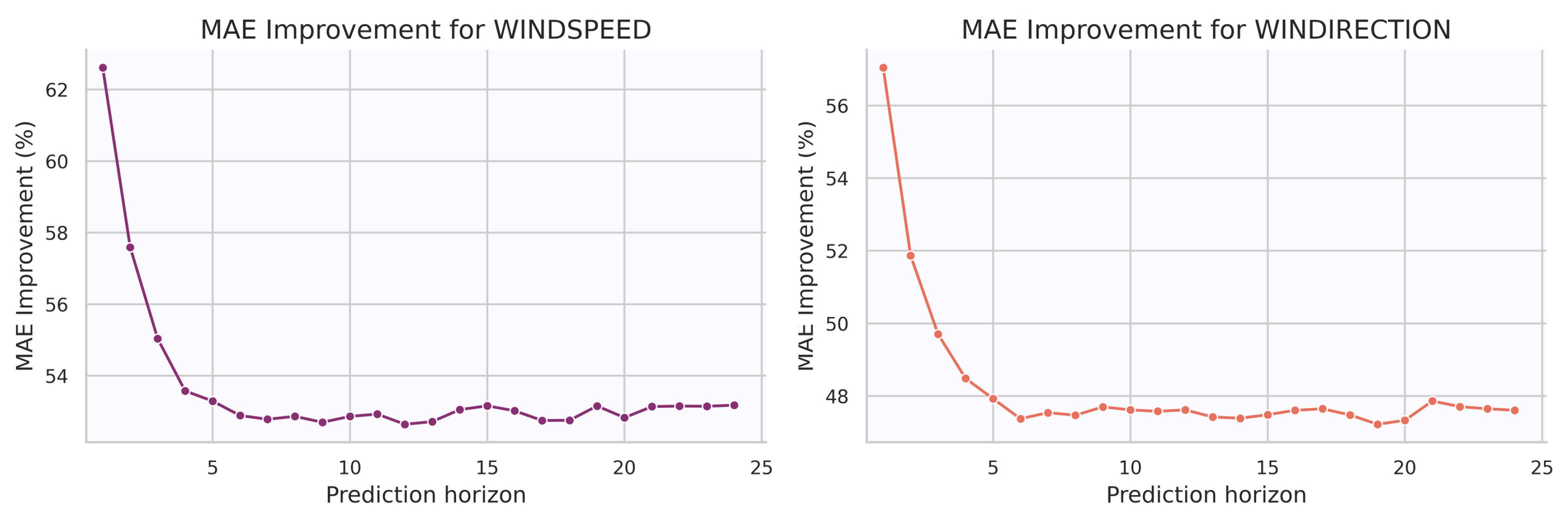 Finally, predictions for wind direction are provided by the 24 trained models. The improvement is again largest for the shortest lead time, reaching values above 56% at 1 h ahead. However, it decreases rapidly during the first few hours and stabilizes around 48% for longer horizons. This pattern is similar to that observed for wind speed, where the improvement also drops quickly after the initial hours. The rapid decay in relative improvement for both wind speed and wind direction highlights the inherent difficulty of predicting wind values.