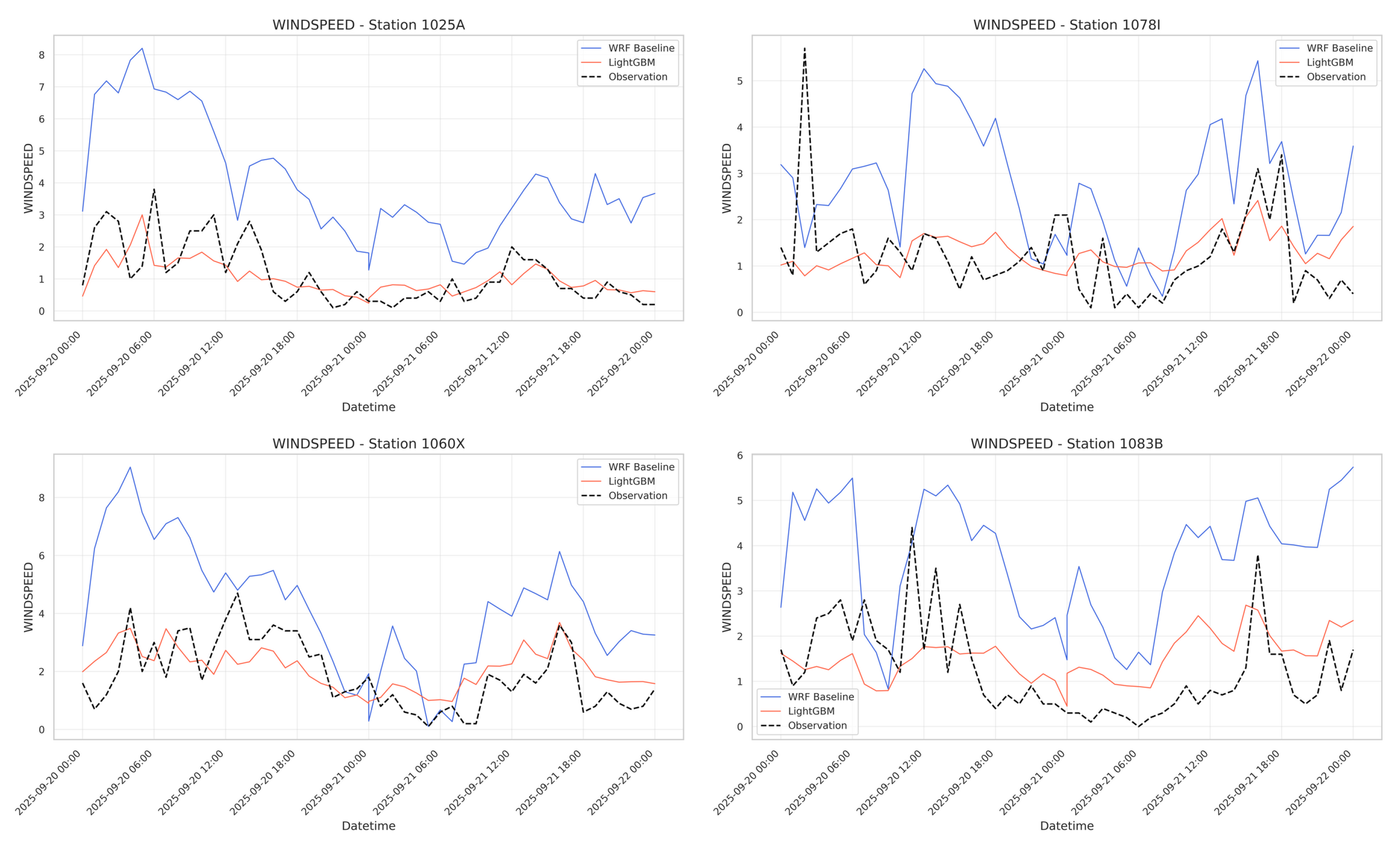 Figure 6 presents a comparative time series of wind speed forecasts from the machine learning (ML) model, the WRF baseline, and actual observations at different 4 of the 18 total stations over the 48 h period. The comparison demonstrates the LGBM model’s superior ability to track the observed wind speed fluctuations closely. Notably, the LGBM forecast effectively captures the timing and amplitude of key wind speed events that the WRF simulation either overestimates. This results visually confirm the quantitative findings presented earlier.