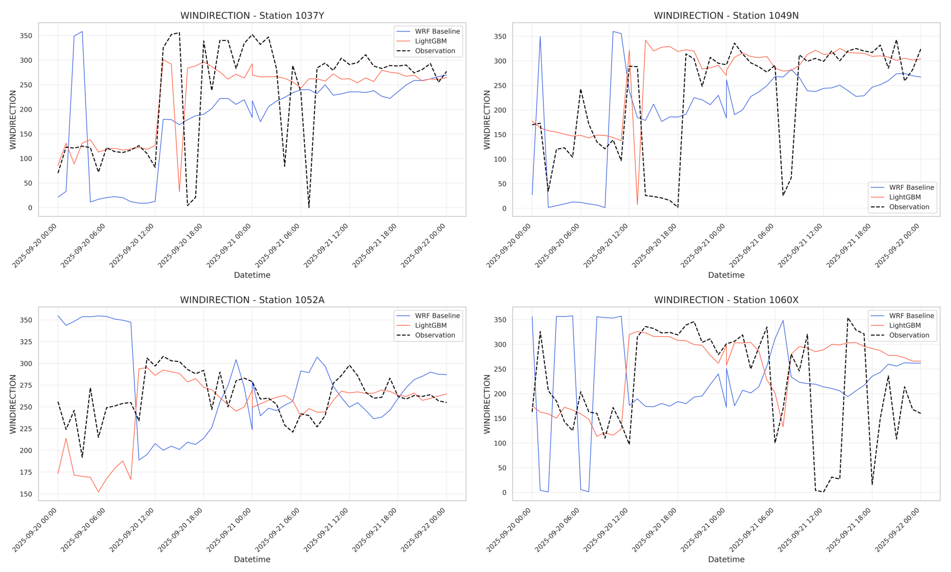 Despite the overall improvement, the correlation coefficient (R) showed only marginal increases, rising from 0.39 to 0.41 with respect to the WRF reference for wind speed forecasts. This implies that while the LightGBM correction effectively reduces amplitude errors, it does not fully reproduce the temporal phase of observed fluctuations. This is probably due to the evaluation metric used during the models training, which was the MAE metric. This means that the optimization process focused on minimizing the average magnitude of the errors rather than maximizing the temporal agreement between the predicted and observed series.