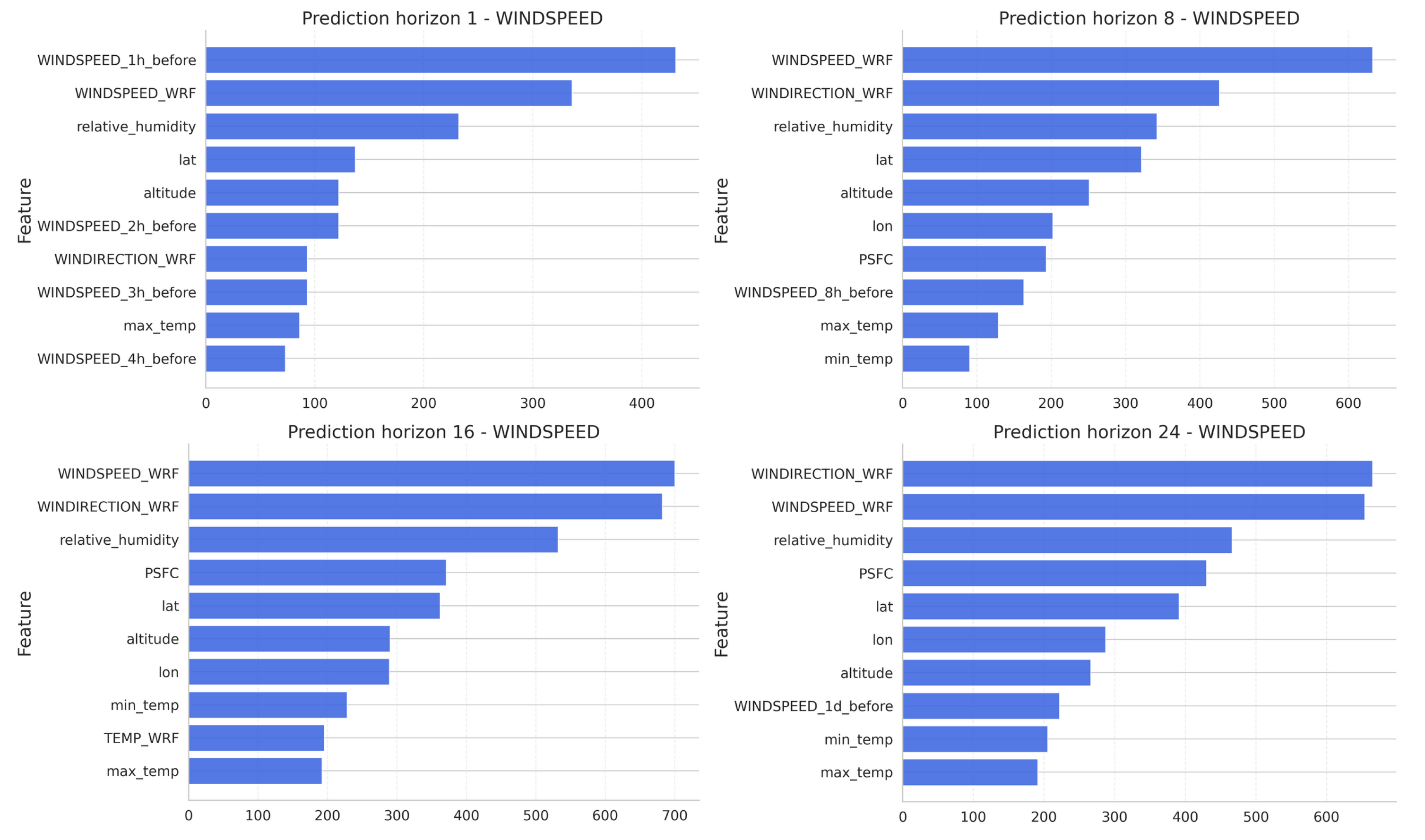 Figure 7 shows the most important features obtained during the training period corresponding to the models of 1, 8, 16 and 24 h of horizon prediction. Results indicate that for very short lead times, recent lagged wind speed values are among the most influential predictors, together with WRF wind variables. However, as the forecast horizon increases, the relative contribution of lagged values decreases, and other predictors such as wind speed and wind direction from WRF model, relative humidity, and surface pressure gain more importance.