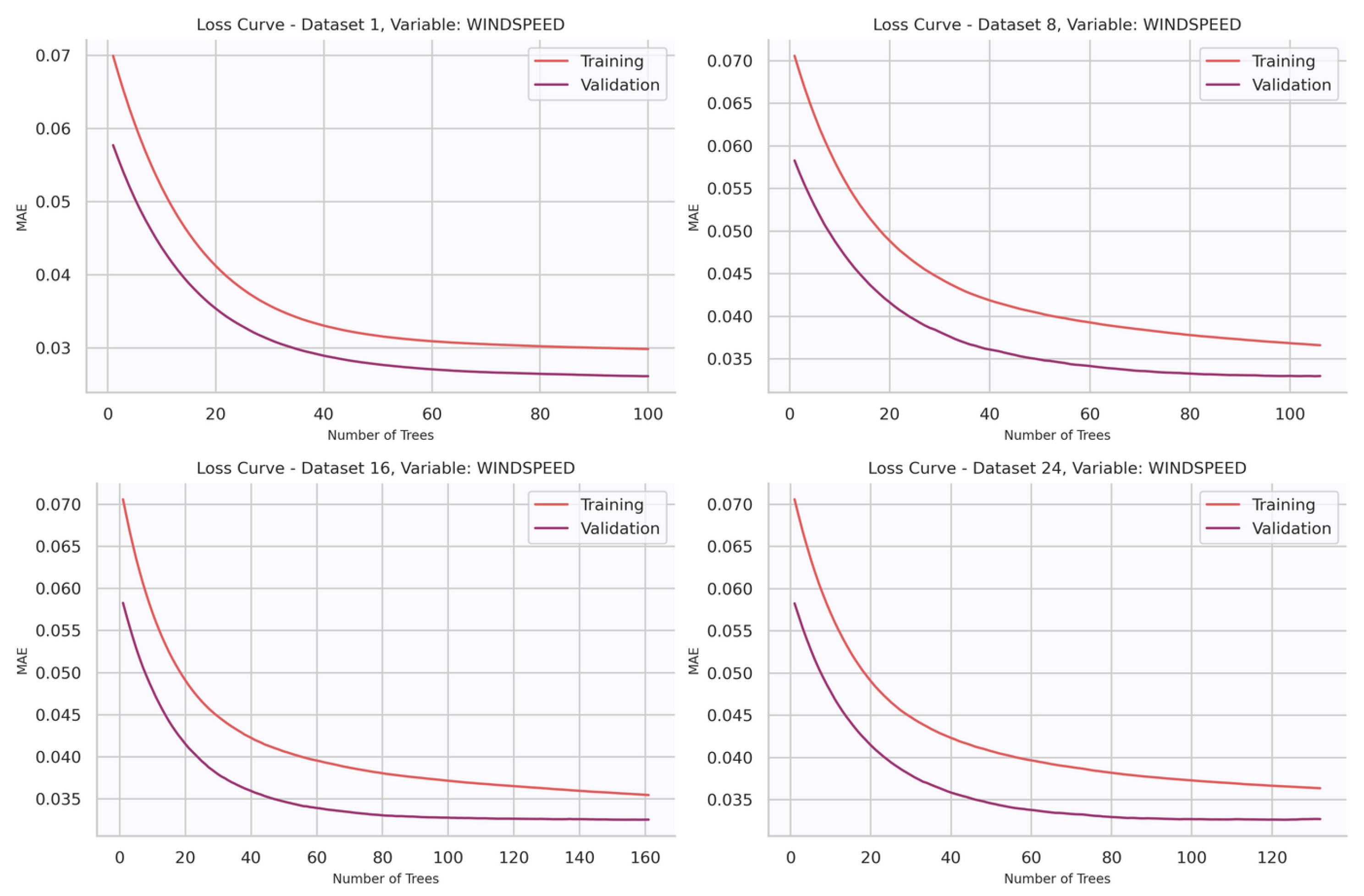 Time series results obtained for the test period demonstrate that the LightGBM model acts as a statistical post-processing tool that reduces the systematic errors present in the baseline WRF forecasts. Rather than replacing WRF or operating as an independent forecasting system, the ML component enhances the short-term accuracy of the numerical model by correcting its local biases. by correcting systematic biases and integrating local observations not fully resolved by the numerical model. Furthermore, the examination of the loss curves during the training and validation phase demonstrates a similar convergence across both datasets. This convergence pattern indicates that the approach does not overfit, demonstrating that LightGBM architecture has successfully learned the intrinsic, non-linear atmospheric dynamics from the input features.