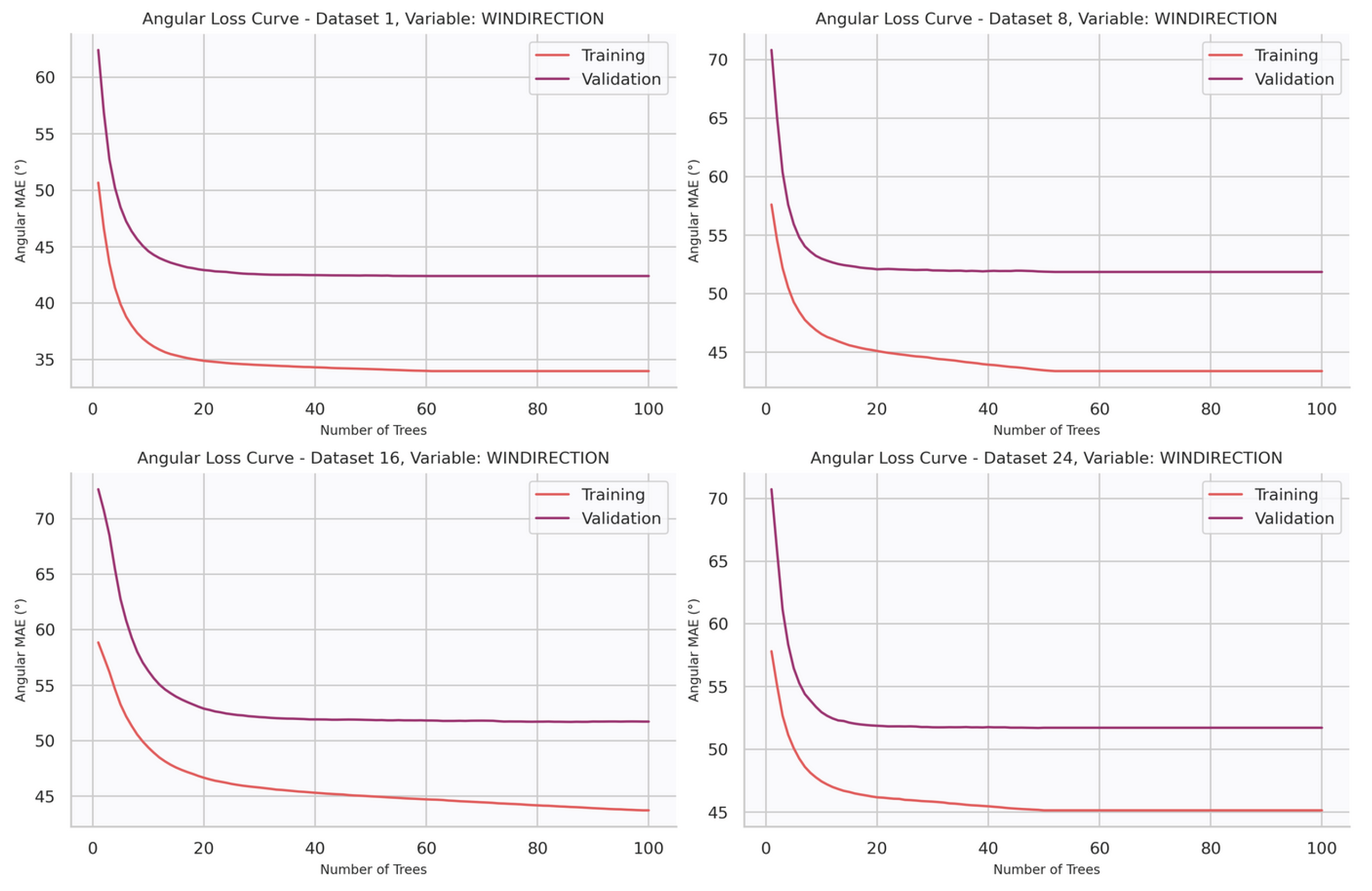 Figure 11 presents the angular loss curves for wind direction prediction at different lead times: 1, 8, 16, and 24 h ahead. In this case, the metric reported is the angular mean absolute error (MAE), which quantifies directional discrepancies in degrees. As with wind speed, the curves show a steep initial decrease followed by progressive stabilization, indicating effective learning of the main predictive signals during the first boosting iterations. Moreover, a clear dependence on the forecast horizon is observed, with errors increasing from shorter (1 h) to longer (16–24 h) lead times. The parallel behavior of training and validation curves also suggests that the models achieve good convergence without signs of overfitting.