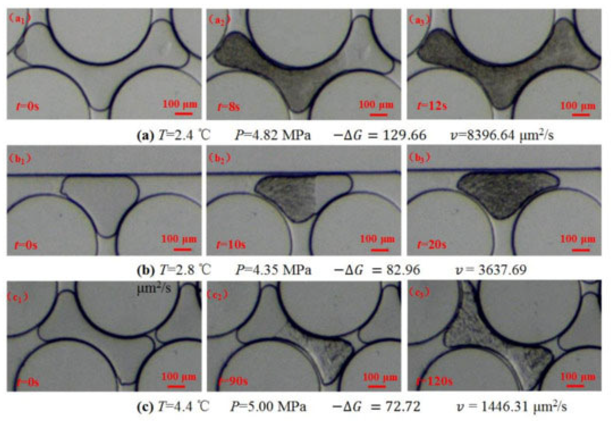 - Li, X.; Wang, C.; Li, Q.; Fan, Q.; Chen, G.; Sun, C. Study on the Growth Kinetics and Morphology of Methane Hydrate Film in a Porous Glass Microfluidic Device. Energies 2021, 14, 6814. [Google Scholar] [CrossRef]