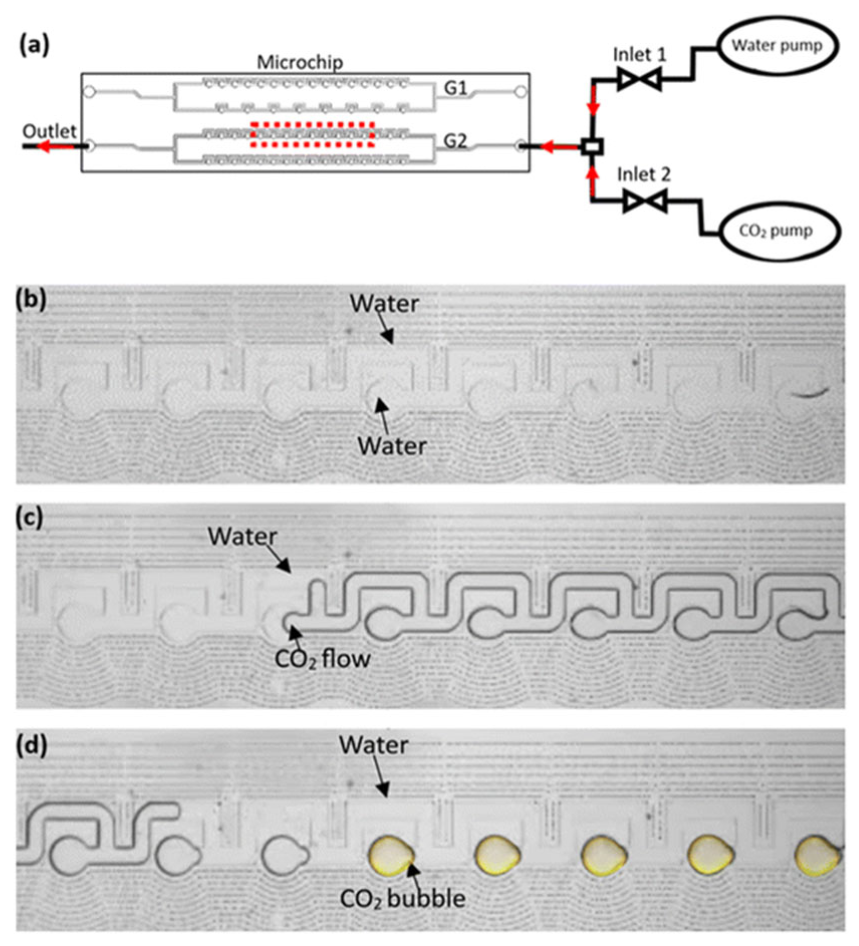 - Yang, J.; Tsai, P.A. Microfluidic Mass Transfer of Supercritical CO2 in Brine. Chem. Eng. Sci. 2024, 300, 120543. [Google Scholar] [CrossRef]