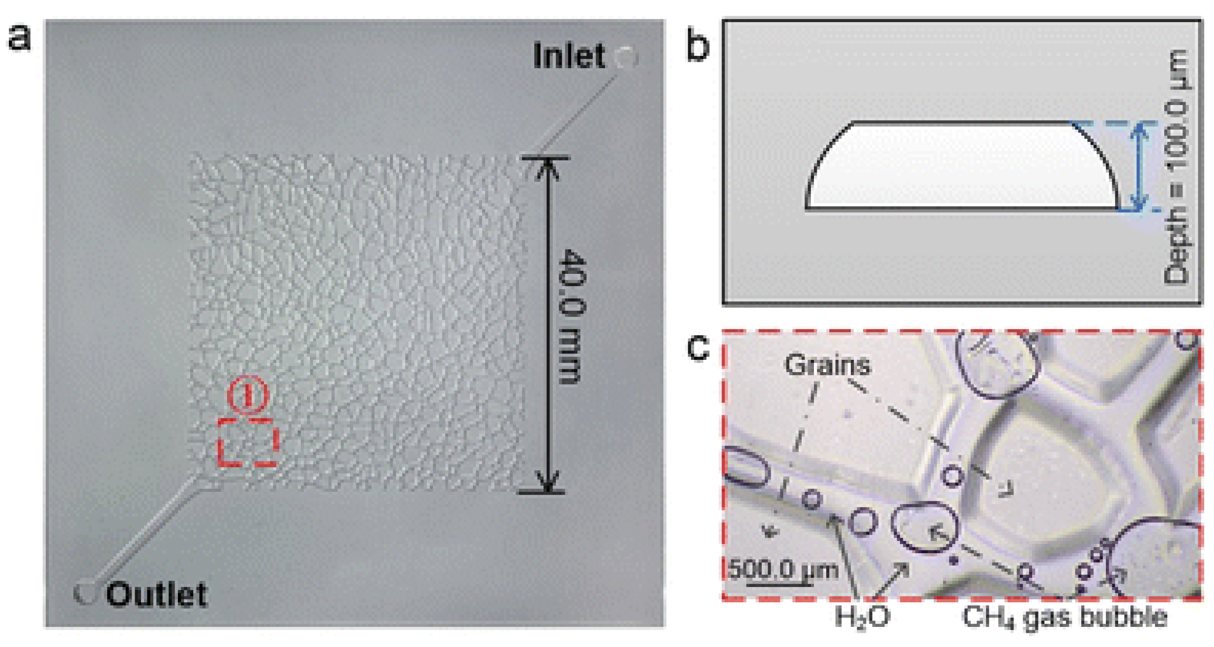 - Wang, Y.; Yang, J.; Wang, P.; Zhu, J.; Chen, Y.J. Impact of Multiphasic Pore-Scale Interactions on Gas Hydrate Formation and Dissociation Characteristics and Kinetics: A Microfluidic Study. Lab Chip 2025, 25, 3741–3765. [Google Scholar] [CrossRef] [PubMed]
