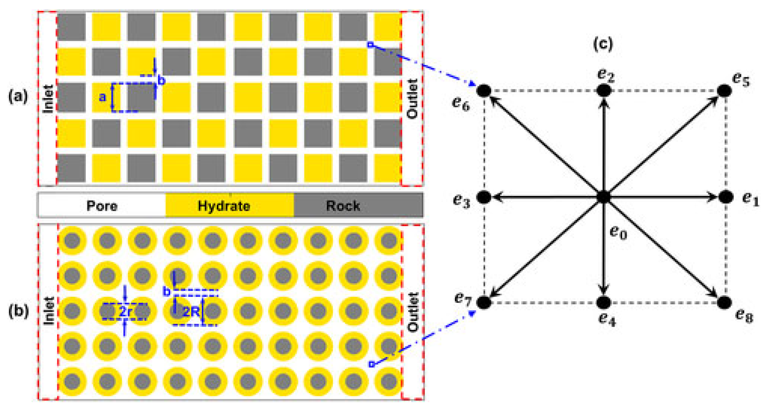 - Zhang, L.; Zhang, C.; Zhang, K.; Zhang, L.; Yao, J.; Sun, H.; Yang, Y. Pore-Scale Investigation of Methane Hydrate Dissociation Using the Lattice Boltzmann Method. Water Resour. Res. 2019, 55, 8422–8444. [Google Scholar] [CrossRef]