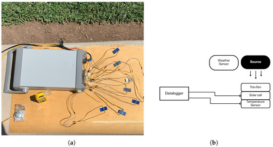 Measurements under clear sky conditions for the comparison of commercial solar cell open circuit voltage drop. (a) Photograph of the system, (b) Schematic of the system.