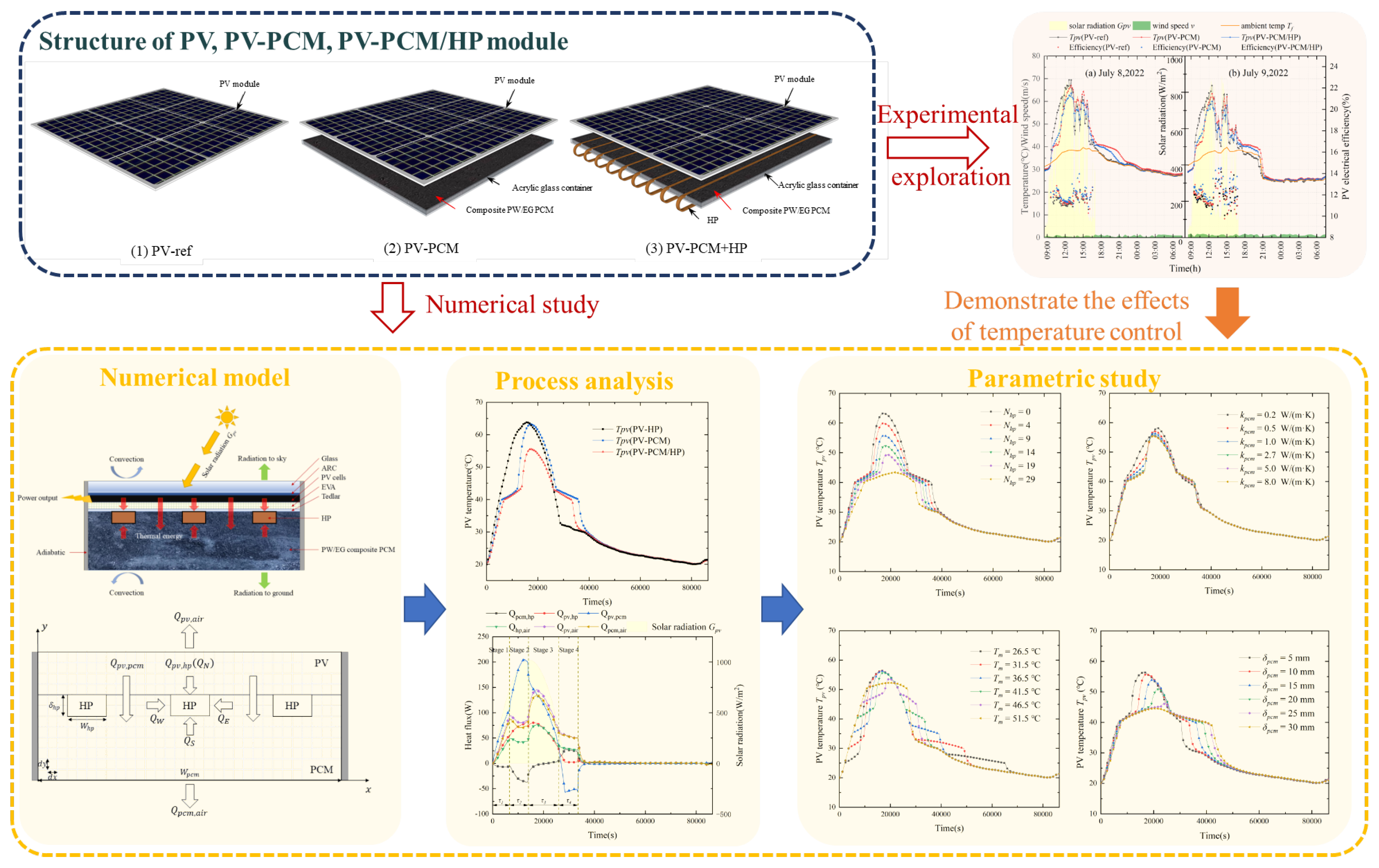 The authors of this article previously researched the cooling effect of single-sided photovoltaic modules when PCM and HP are combined. Through model experiments and numerical analysis, it was proven that the coupling of PCM and HP can effectively reduce the temperature of photovoltaic modules, which is conducive to increasing their power generation (Figure 1) [25]. Meanwhile, the authors’ univariate analysis indicated that the key parameters of the coupled cooling device must be determined in accordance with local meteorological conditions. Due to the interplay of factors such as solar radiation intensity, ambient temperature, and wind speed, the aforementioned study could not fully reveal the adequacy and effectiveness of the coupled cooling method under realistic weather conditions in different regions. Building upon previous research, this study designed a modular PCM/HP thermal regulation device and applied it for the first time to a full-scale commercial photovoltaic module. Field tests were conducted at three different locations to compare and analyze the cooling and efficiency enhancement effects of using pure PCM versus a combined PCM/HP system on PV panels. The suitability of the thermal regulation device under varying meteorological conditions was also investigated. The contributions of this research are primarily reflected in the following aspects:
